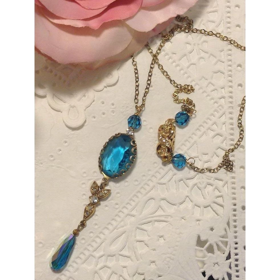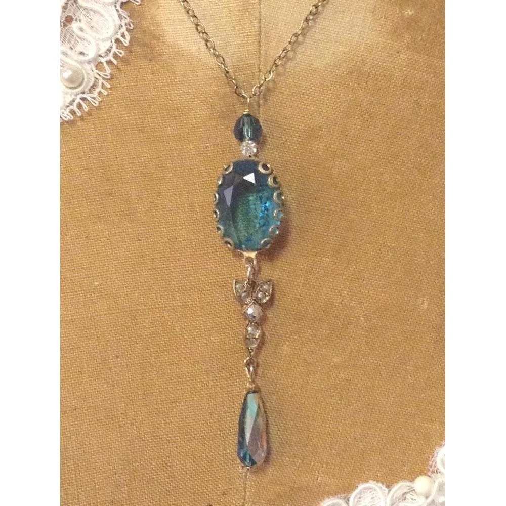 This gorgeous one-of-a-kind, 2 7/8″ long vintage assemblage pendant is made with aquamine crystals set in an antiqued brass setting.
