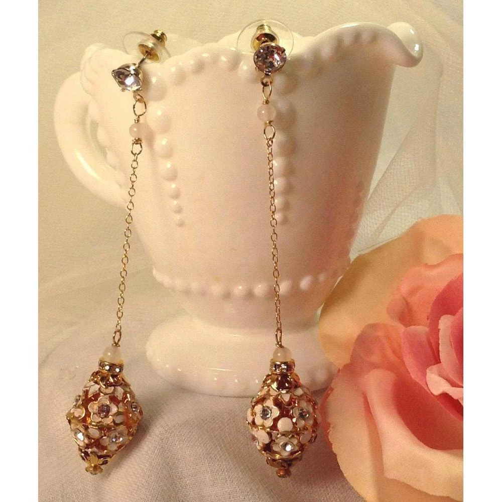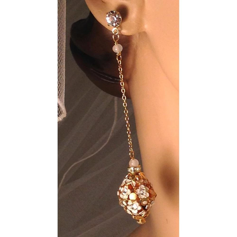 These beautiful, one-of-a-kind gold bridal earrings are made of rare vintage enameled and rhinestone Japanese beads, vintage opal glass pearls, gold plated bead caps, delicate gold-filled chain and Swarovski rhinestones.