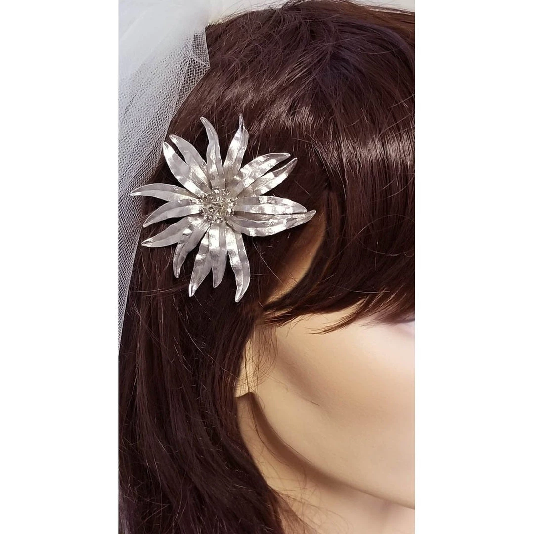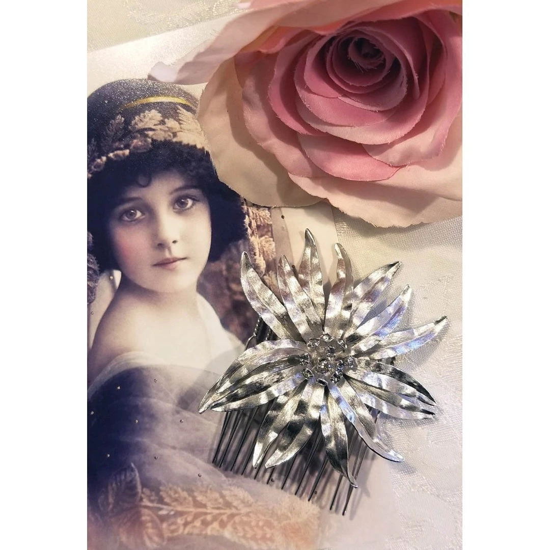 This pretty handcrafted bridal comb is made of a vintage brushed silver flower pin with, Black Diamond (grey) Swarovski crystals accents.