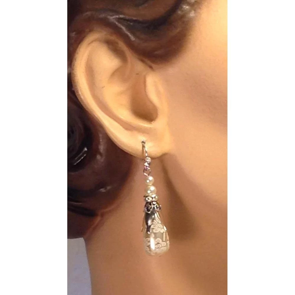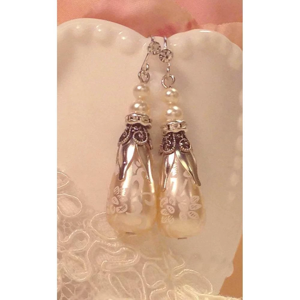 These stunning limited edition bridal or bridal party earrings are made of large unique vintage ivory lace-patterned pearls, matching cream Swarovski pearls, layered vintage and antiqued silver bead caps and Swarovski rhinestone crystals.