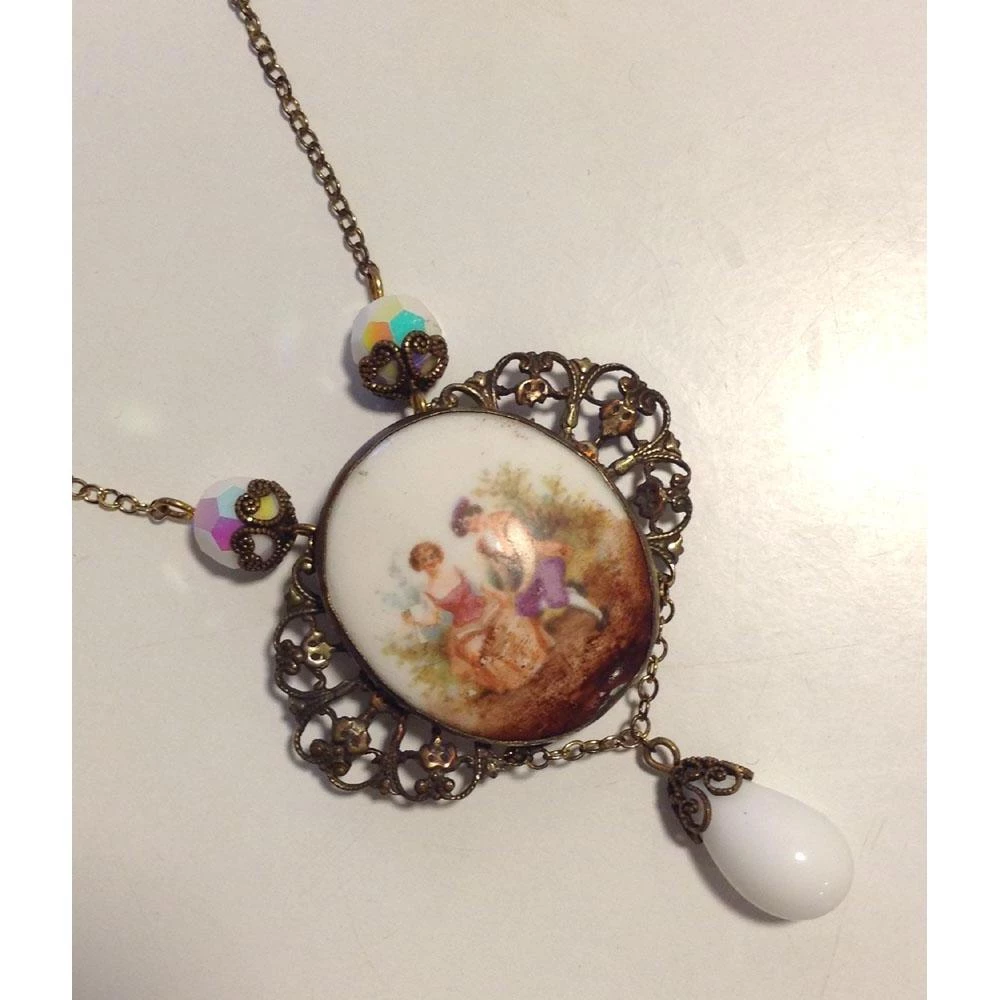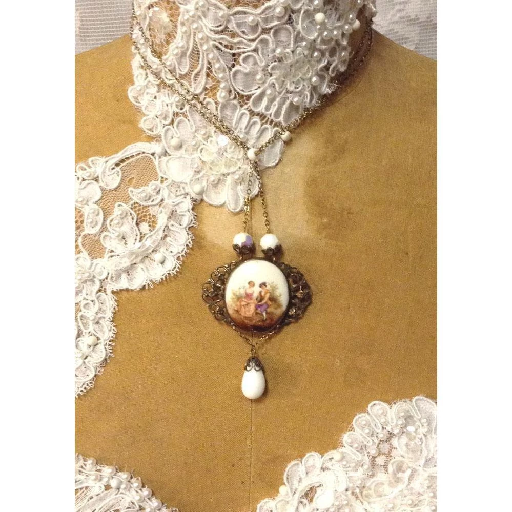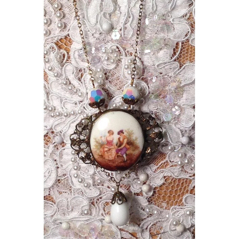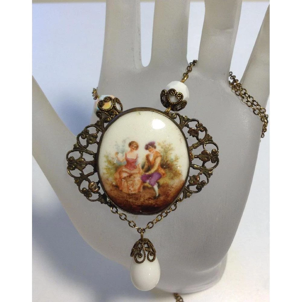 The centerpiece of this romantic necklace is a beautiful unsigned vintage porcelain & filigree Limoges brooch that features a courting couple; part of Limoges “Lovers” series. The brooch appears to be quite old with the c-clasp still in tact.