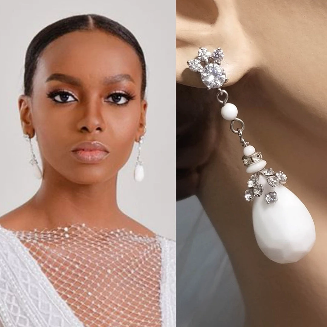 These spectacular, one-of-a-kind, bridal earrings are made of vintage milk glass and rhinestone components.