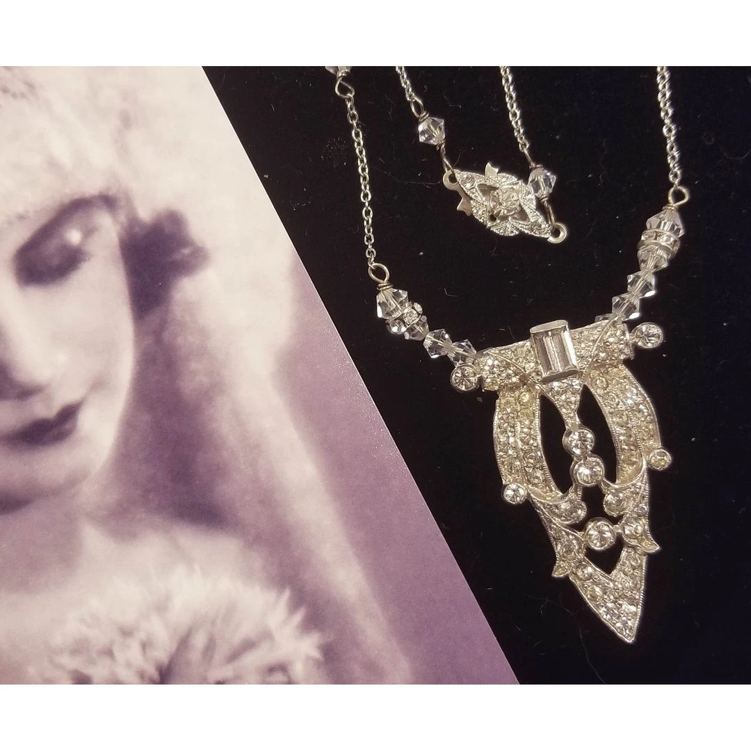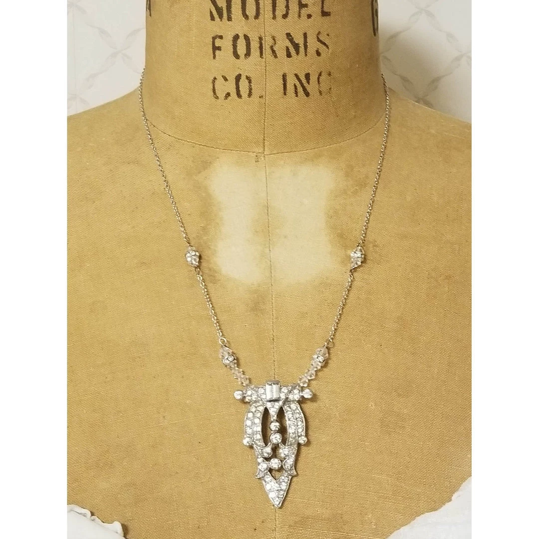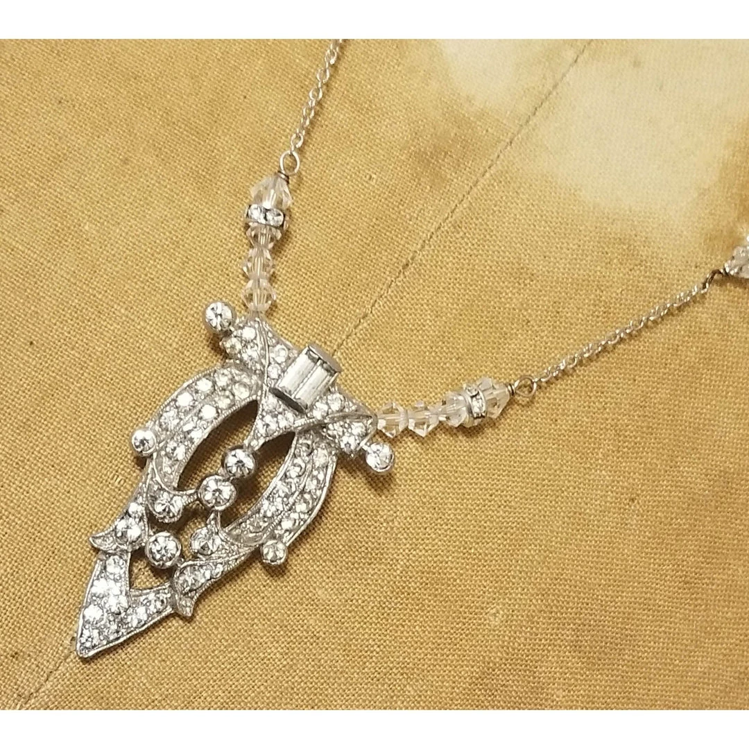 This beautiful one of a kind handcrafted bridal necklace features a gorgeous 1 3/4″ 1940s rhinestone dress clip mixed with beads that have been rescued from a broken necklace, vintage chain, and a never-used vintage rhinestone locking clasp.