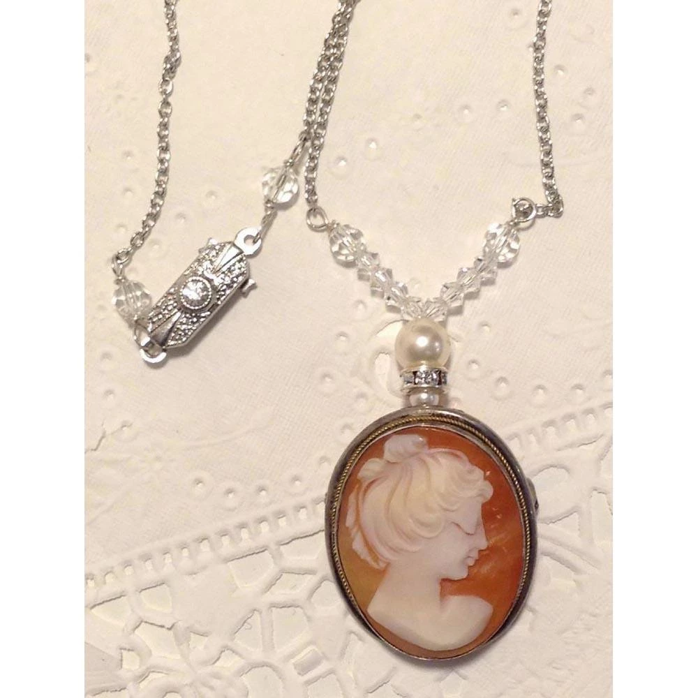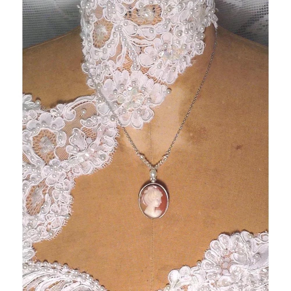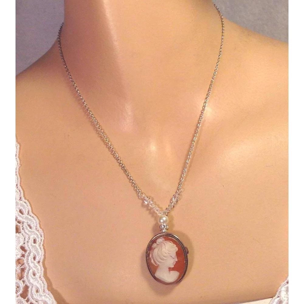The cameo is accented with a cream Swarovski pearl and Swarovski crystals, and hangs from a delicate rhodium-plated chain.