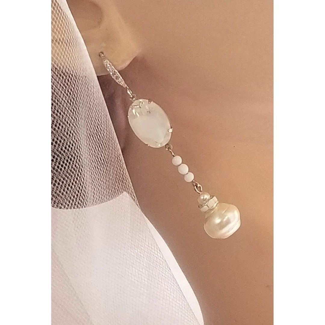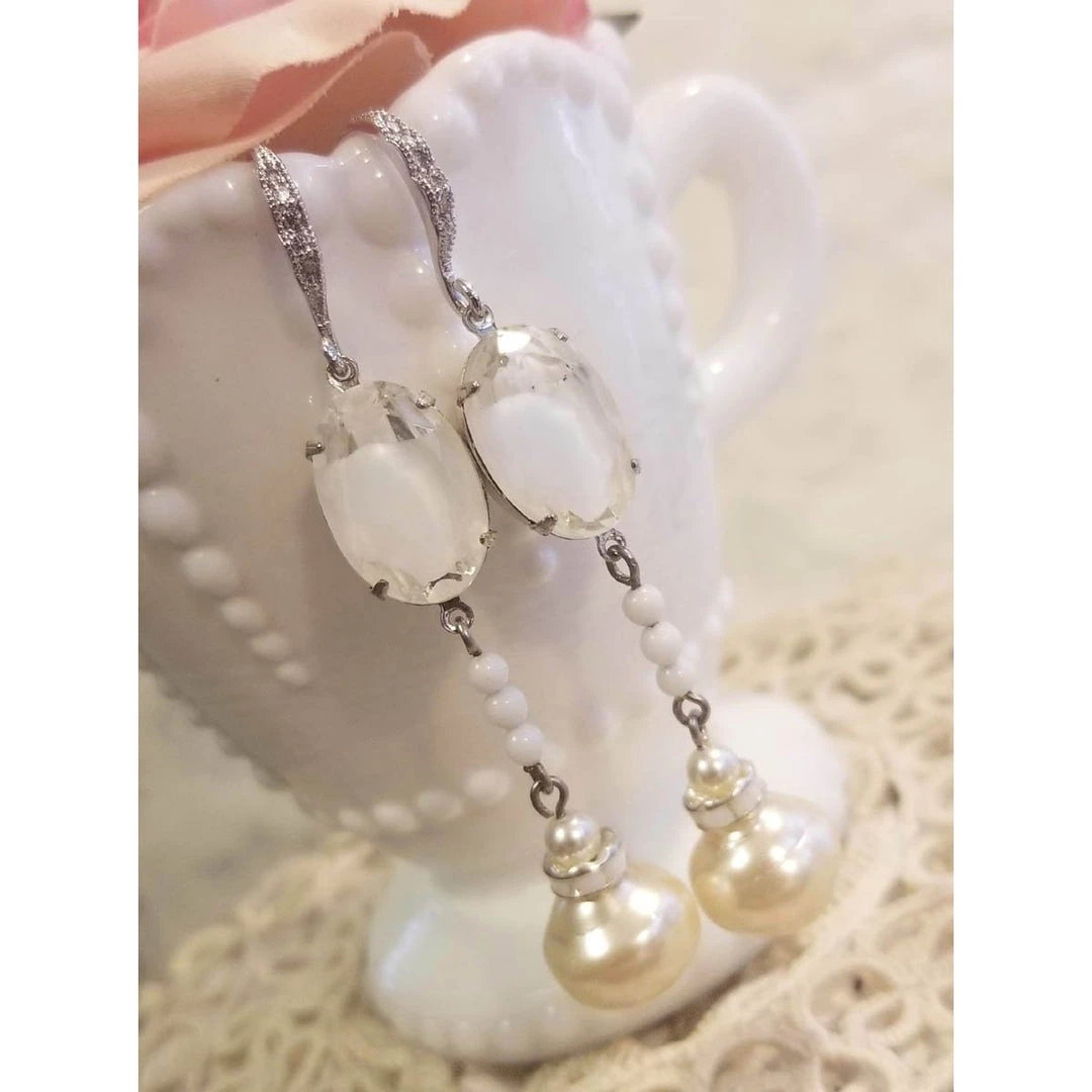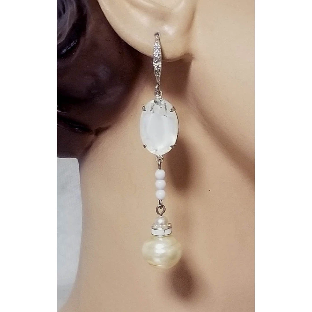 These amazing, one-of-a-kind, bridal earrings are made of large white vintage givre crystals, large vintage ivory baroque pearls, cream Swarovski pearls, and milk glass rhinestone crystals.