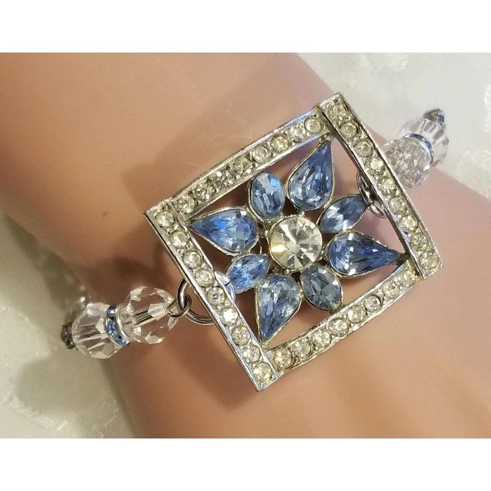 It is made of a 1960s light sapphire vintage brooch that has been embellished with both new and vintage crystals to create this striking statement piece for your special day!