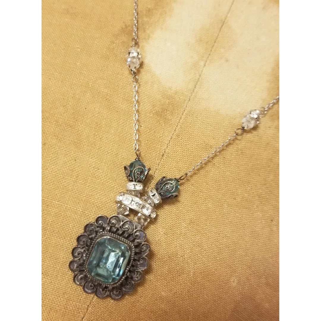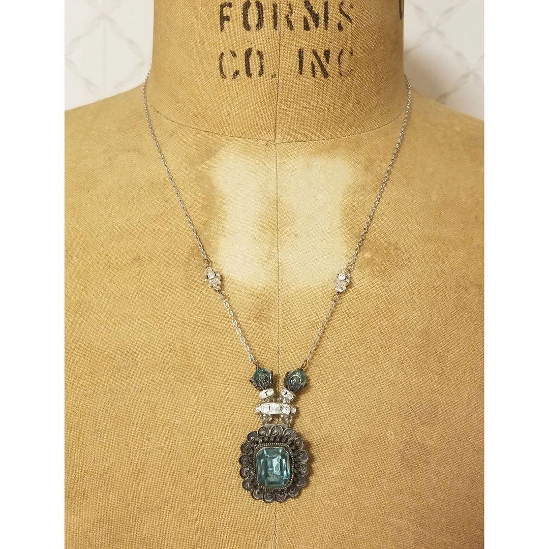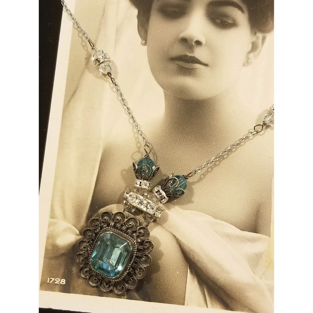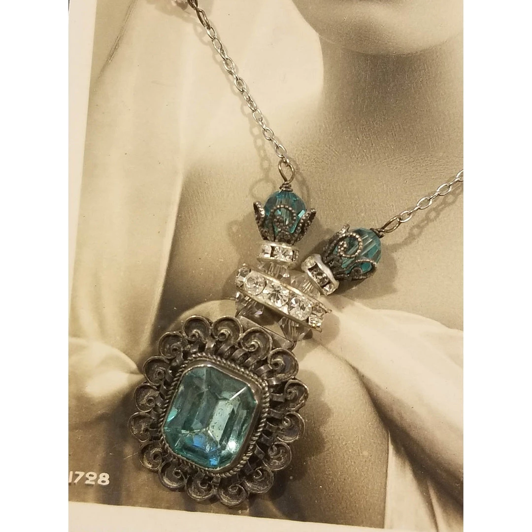 The pendant on this beautiful one of a kind necklace is made of a vintage 1940s silver and aquamarine rhinestone earring and beads that have been rescued from broken jewelry.