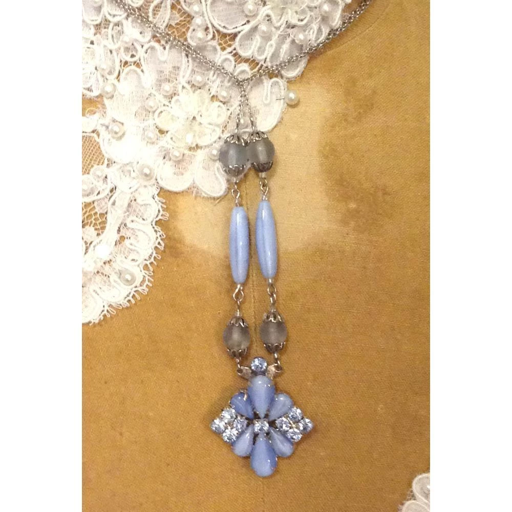 The centerpiece of this unique necklace is a beautiful unsigned 1940s vintage blue givre and light sapphire earring component that has been mixed with delicate vintage blue glass beads.
