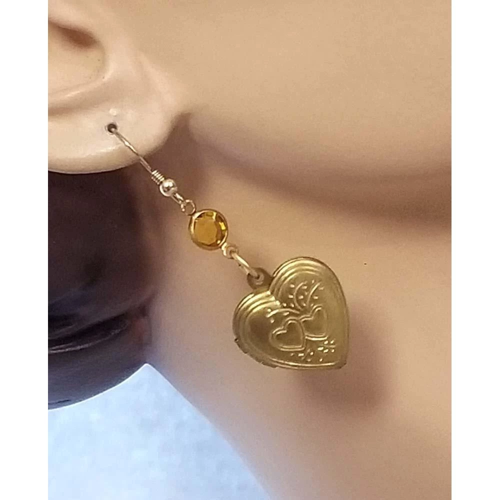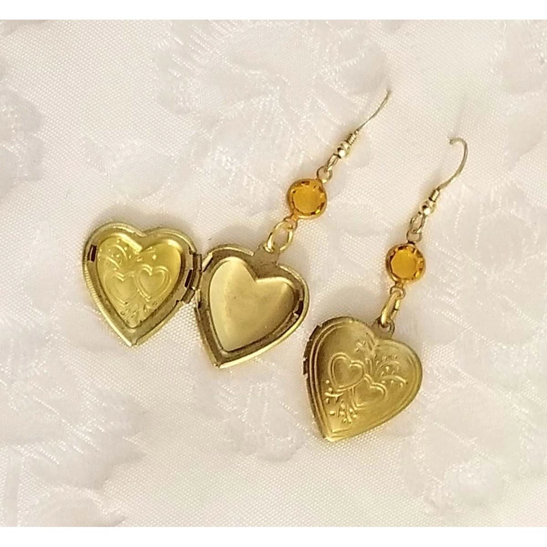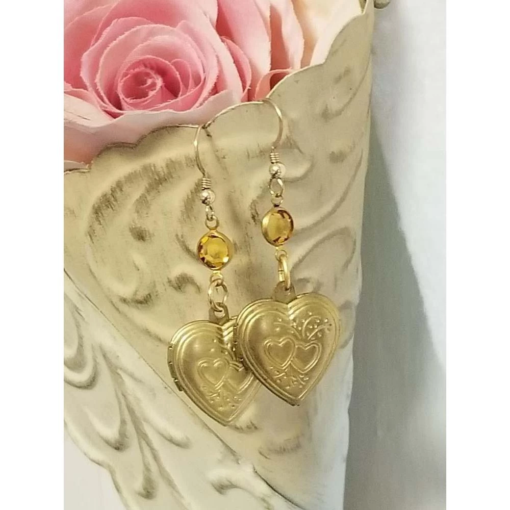 earrings are made with a mix of vintage topaz channel crystals and functional vintage heart lockets.