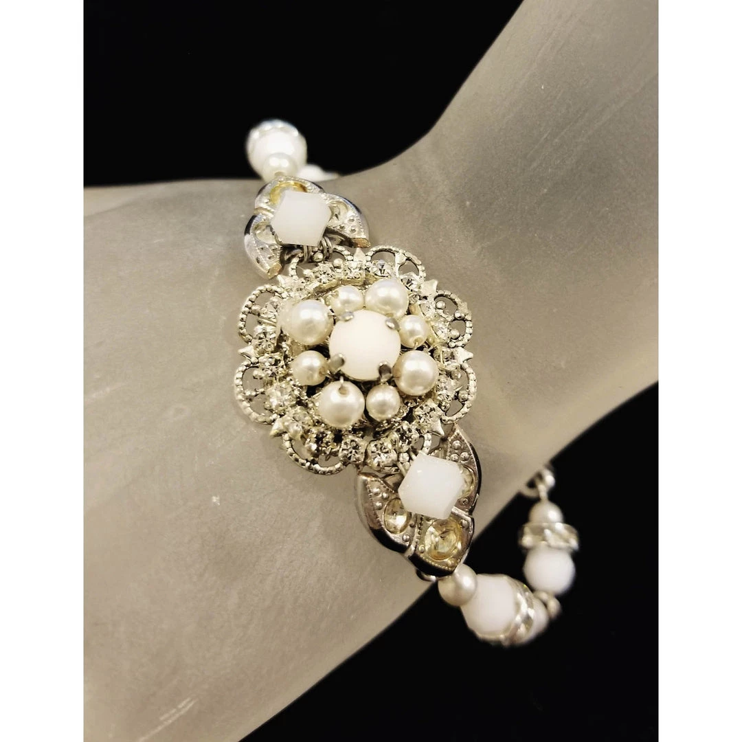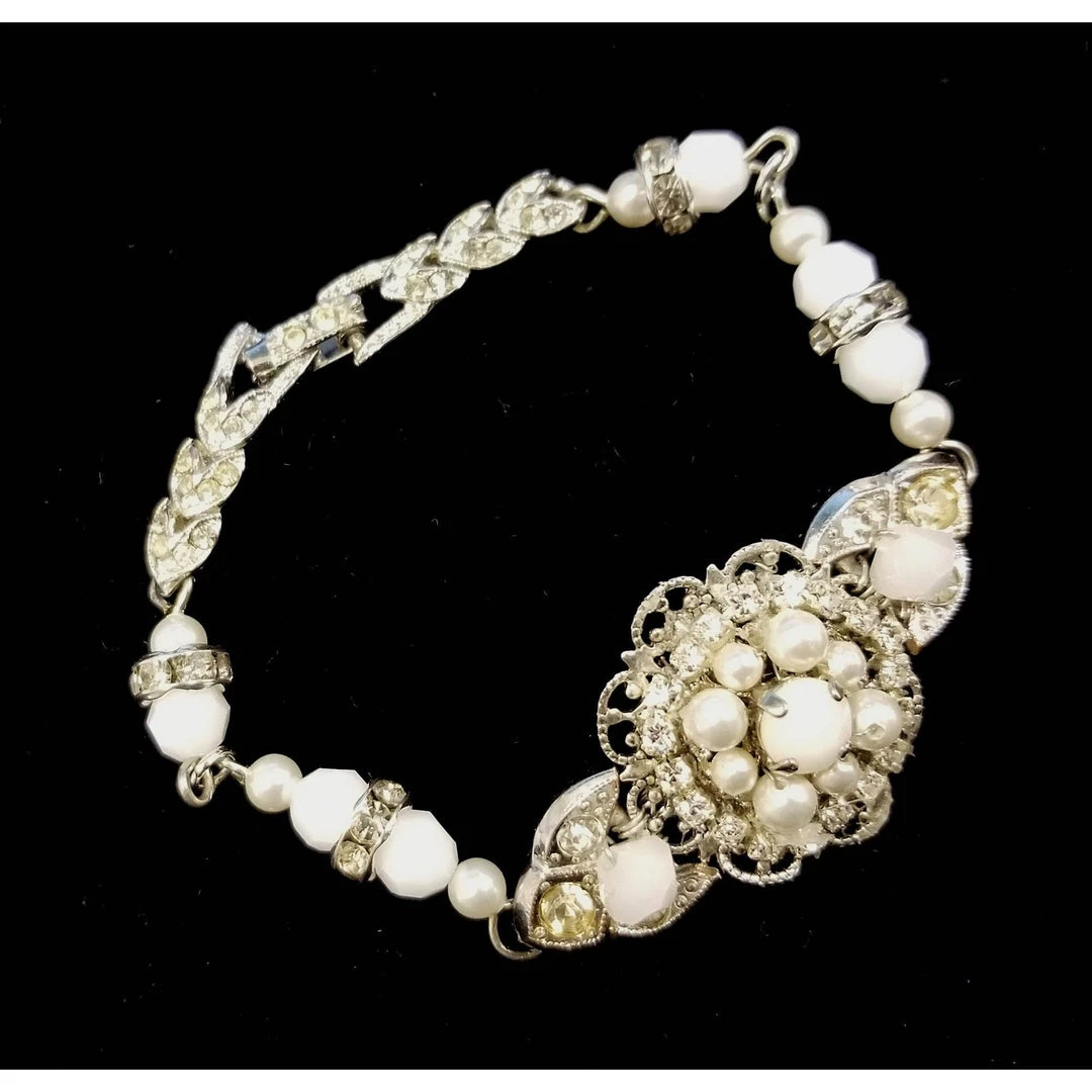 This delicate bracelet features a vintage milk glass, rhinestone and pearl earring, and links and a clasp rescued from two different vintage rhinestone bracelets.Â