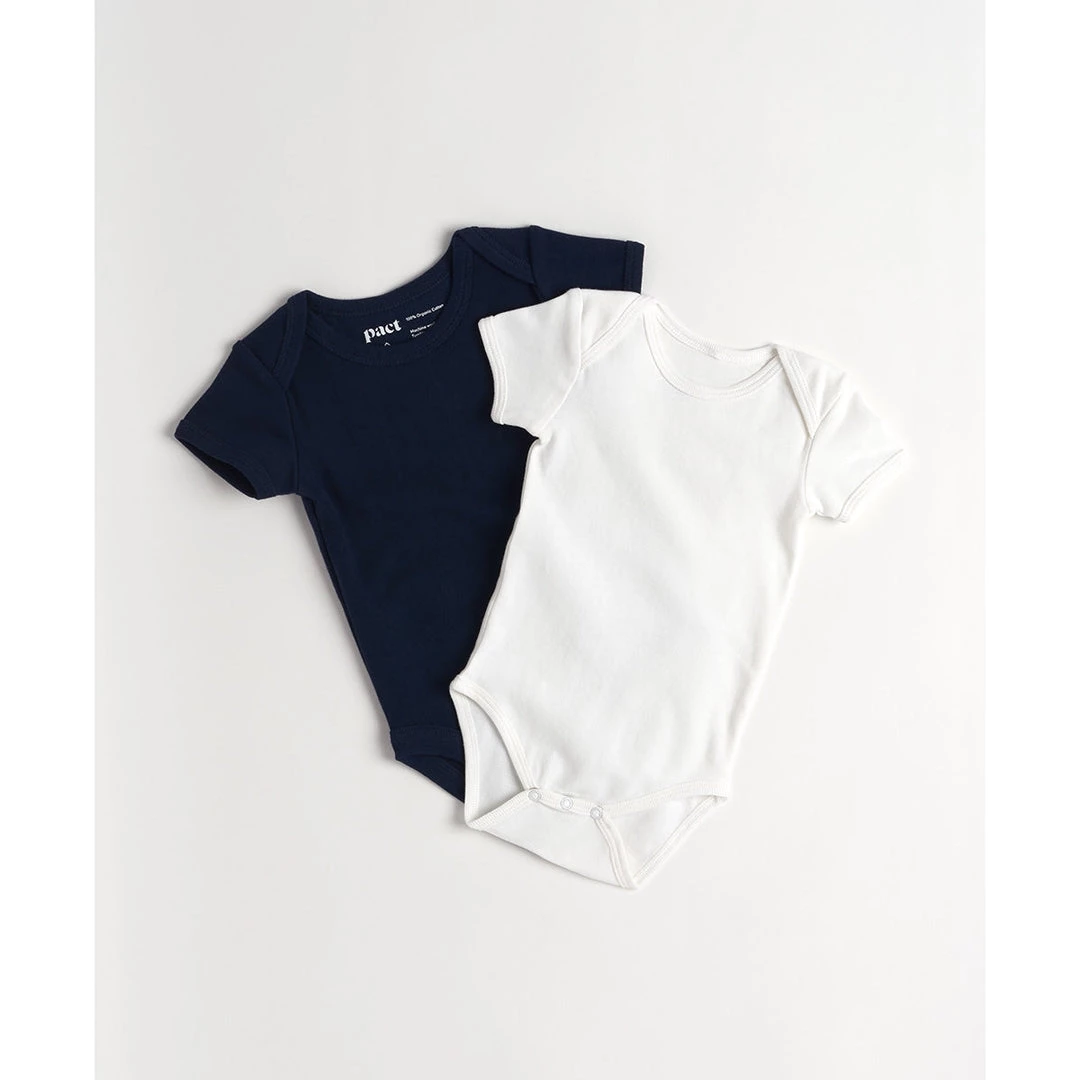 Baby’s True Navy/White Short Sleeve Bodysuit 2-Pack Newborn. Super soft organic baby’s clearance Short Sleeve Bodysuit 2-Pack from Wear PACT. Fair Trade Factory. GOTS Certified Organic Cotton