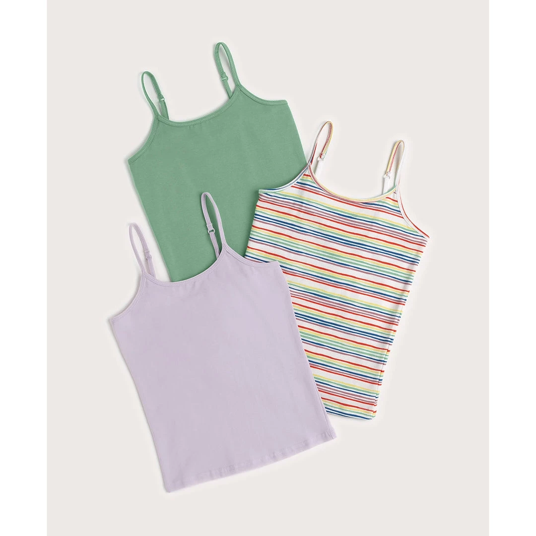 Kid’s Aloe/Splash Stripe/Iris Cartwheel Cami 3-Pack 0T. Super soft organic kids’s clearance Cartwheel Cami 3-Pack from Wear PACT. Fair Trade Factory. GOTS Certified Organic Cotton