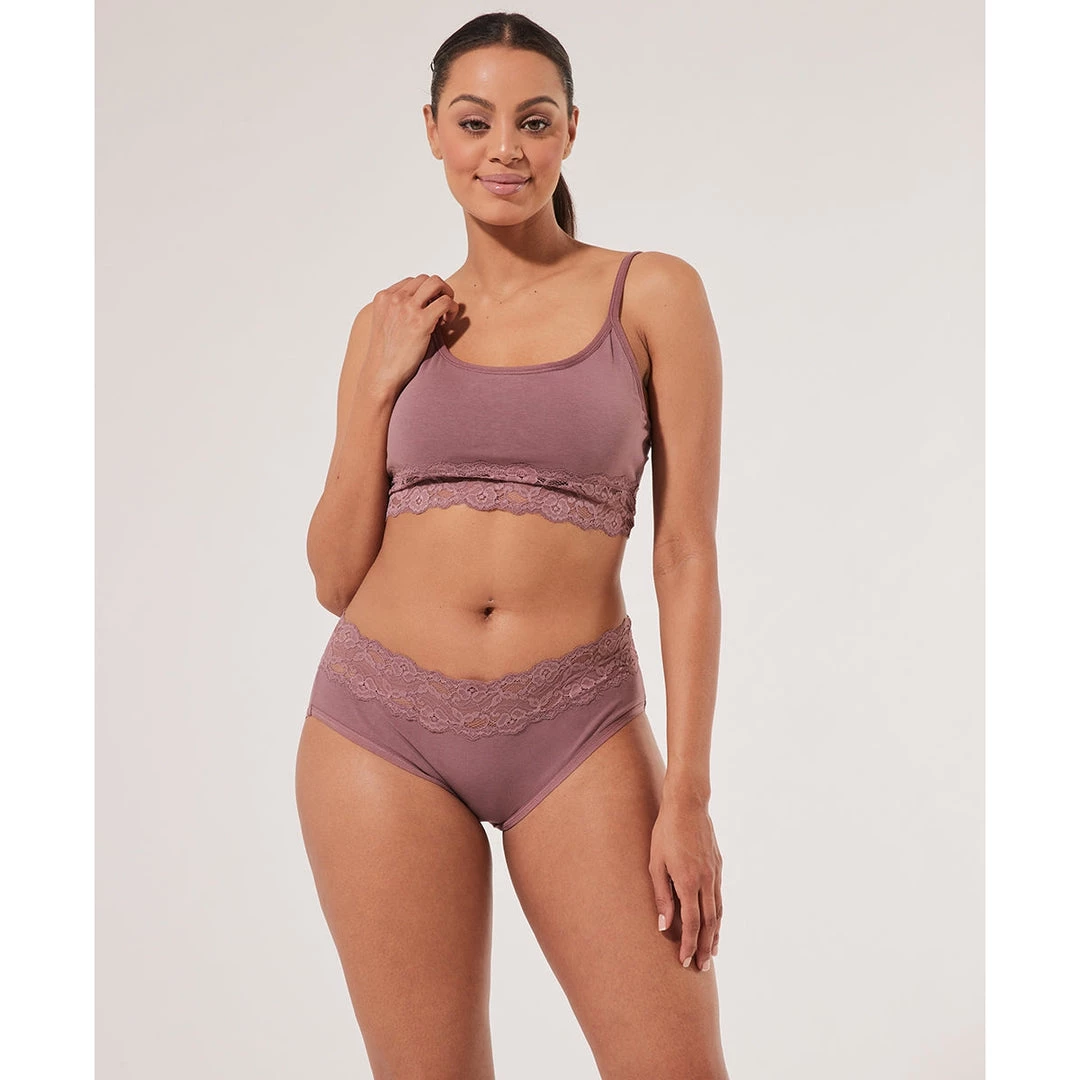 Women’s Rose Taupe Lace-Waist Brief 2X. Super soft organic women’s Lace-Waist Brief from Wear PACT. Fair Trade Factory. GOTS Certified Organic Cotton