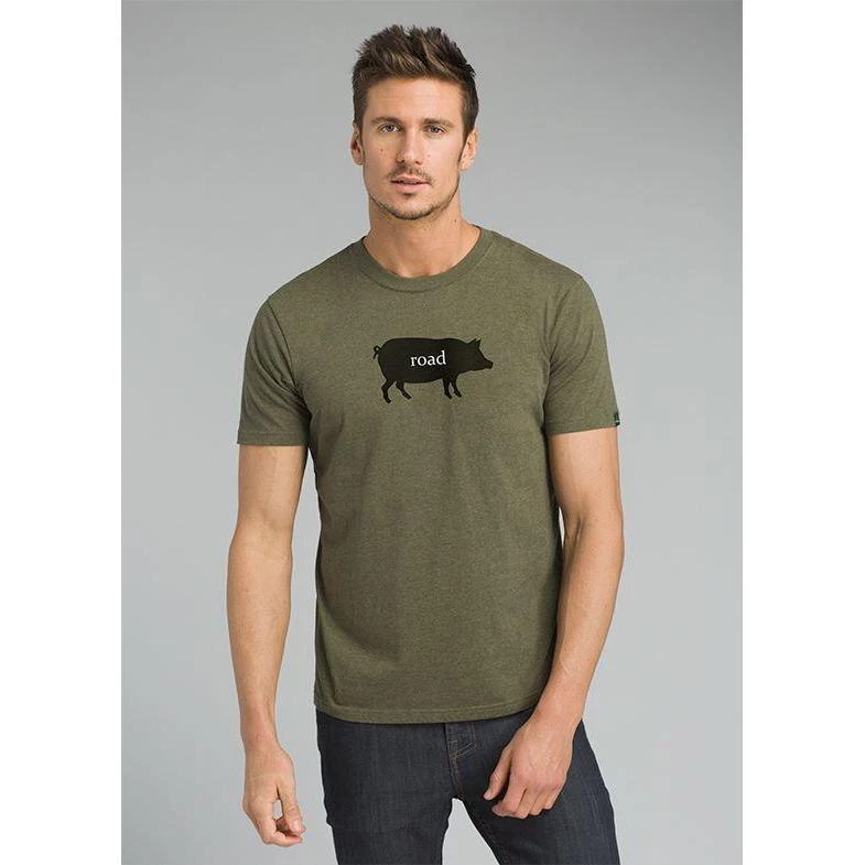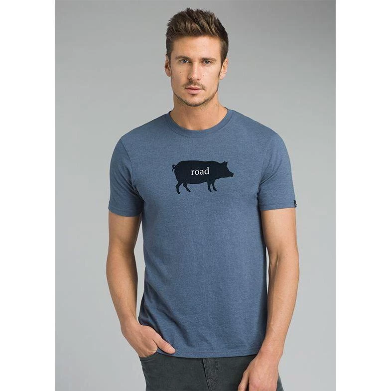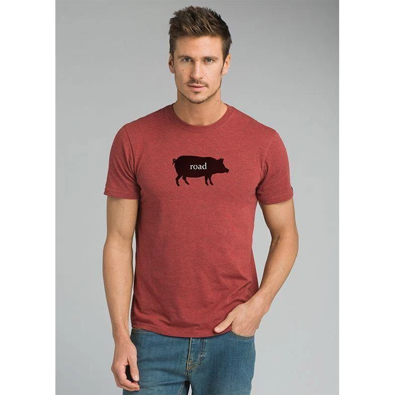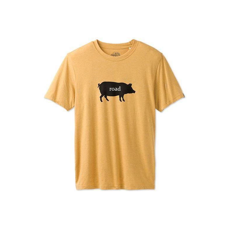 The lightweight Road Hog Journeyman tee features a graphic of a hog with the word road overtop of it and is made from an organic cotton/recycled polyester blend.