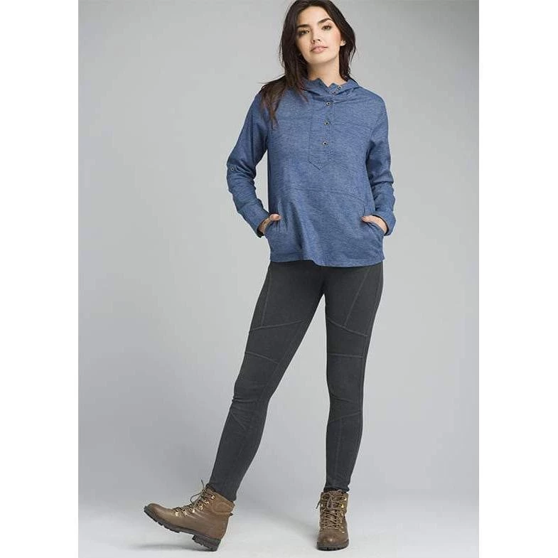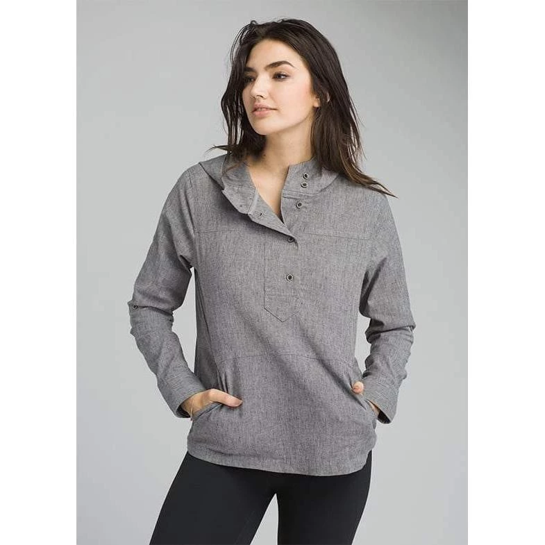 The Shelton women’s top features a button front placket, a front kangaroo pocket and side seam vents. The pullover is constructed from a hemp/recycled polyester blend.