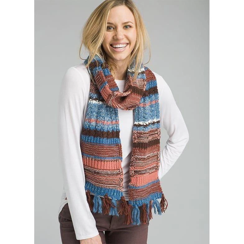 The Virginia Scarf is a mixed texture skinny scarf featuring tassels on each end.
