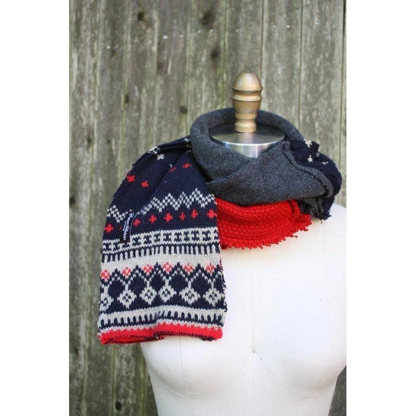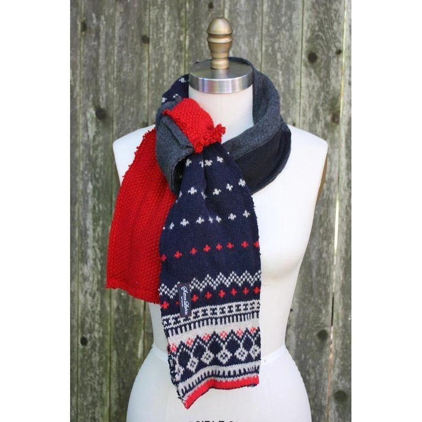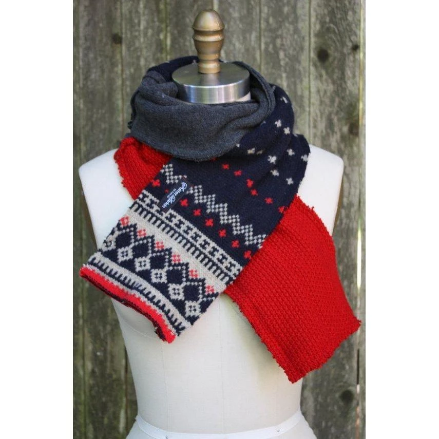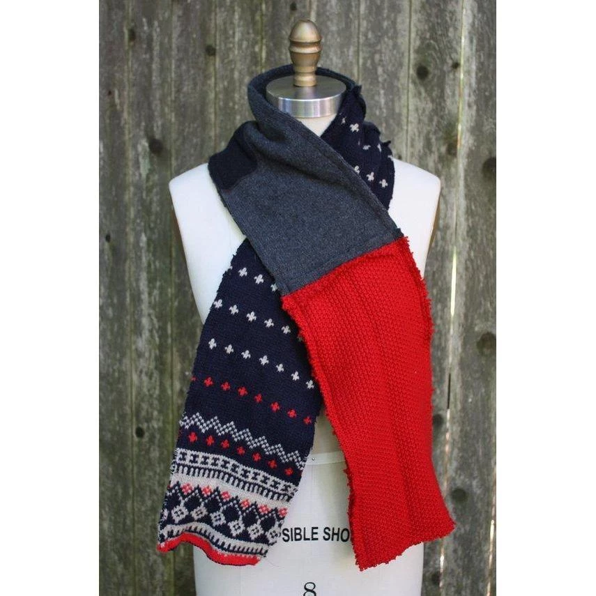This chunky, patchwork scarf is the perfect winter accessory. The red, gray and navy winter prints come together to create a modern classic that keeps you warm. So many wears to wear it make it so fun to wear. Â