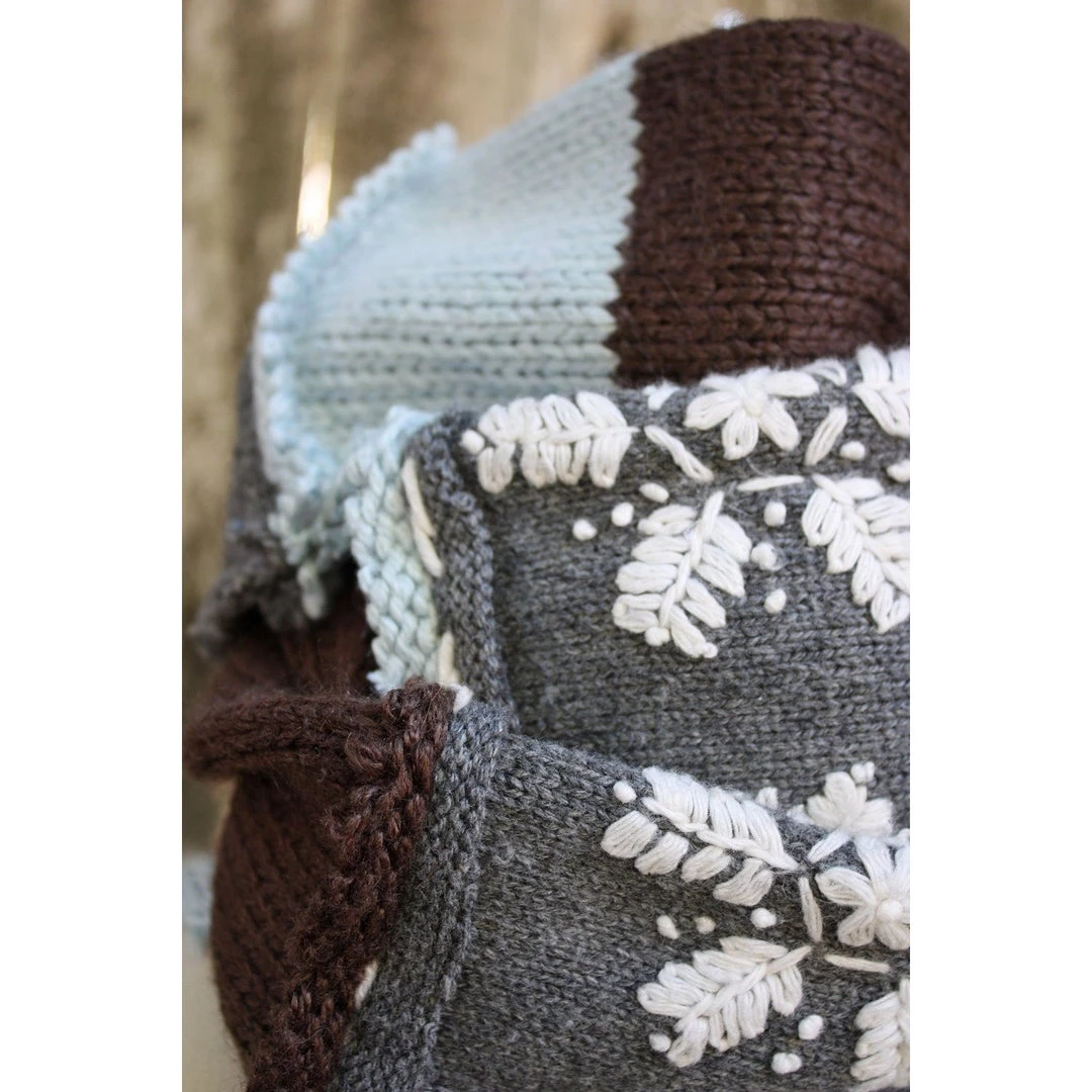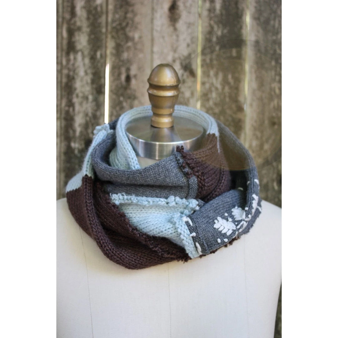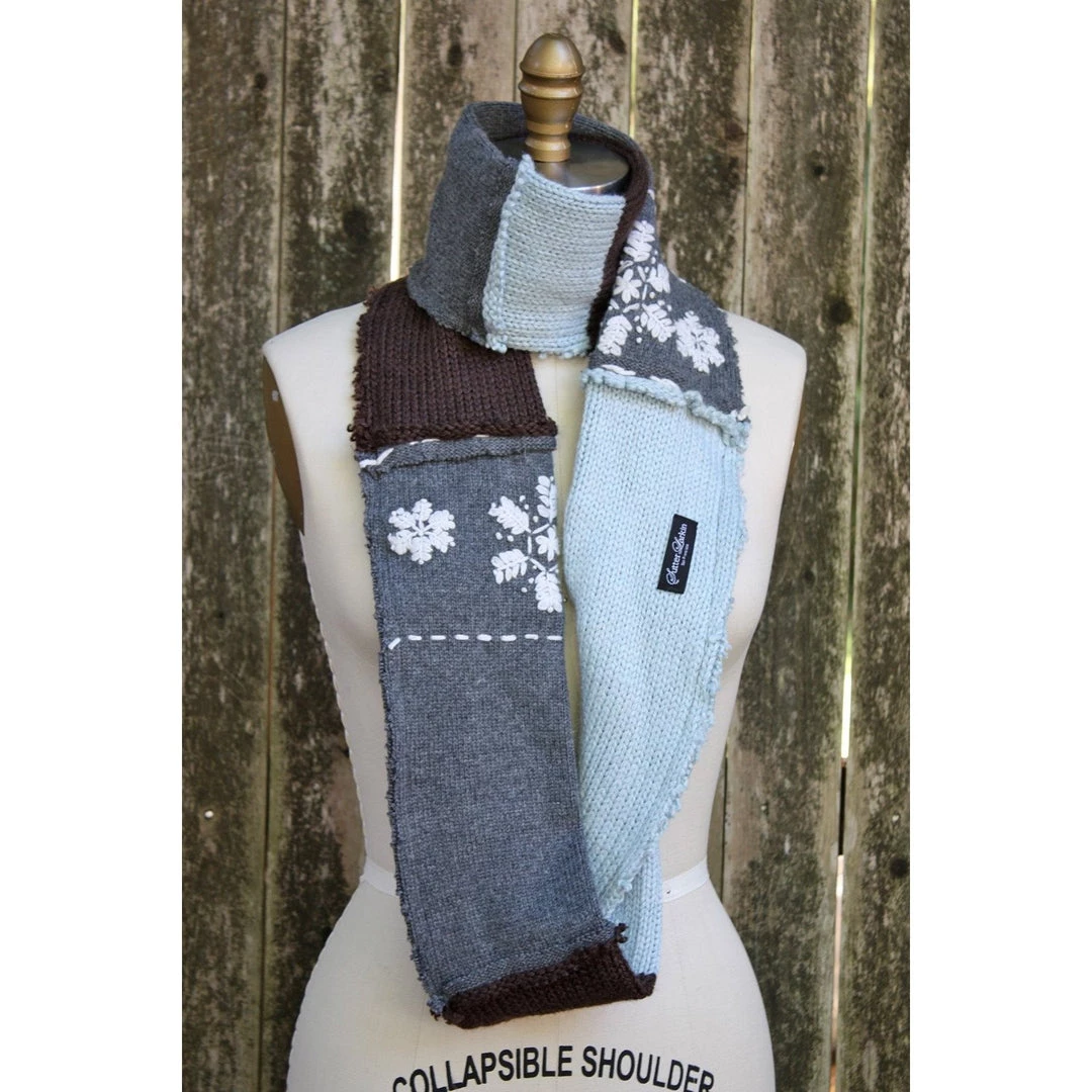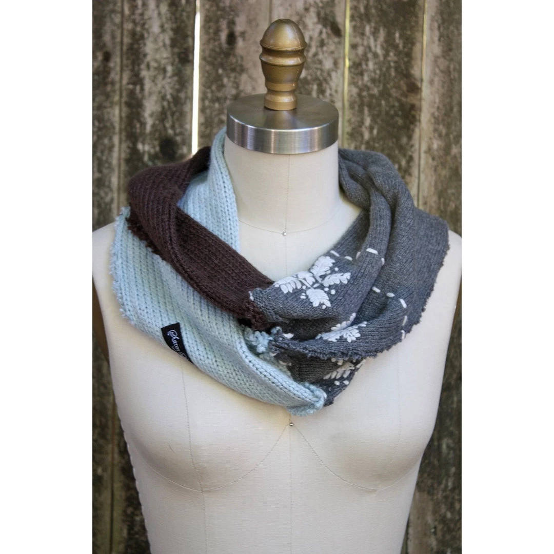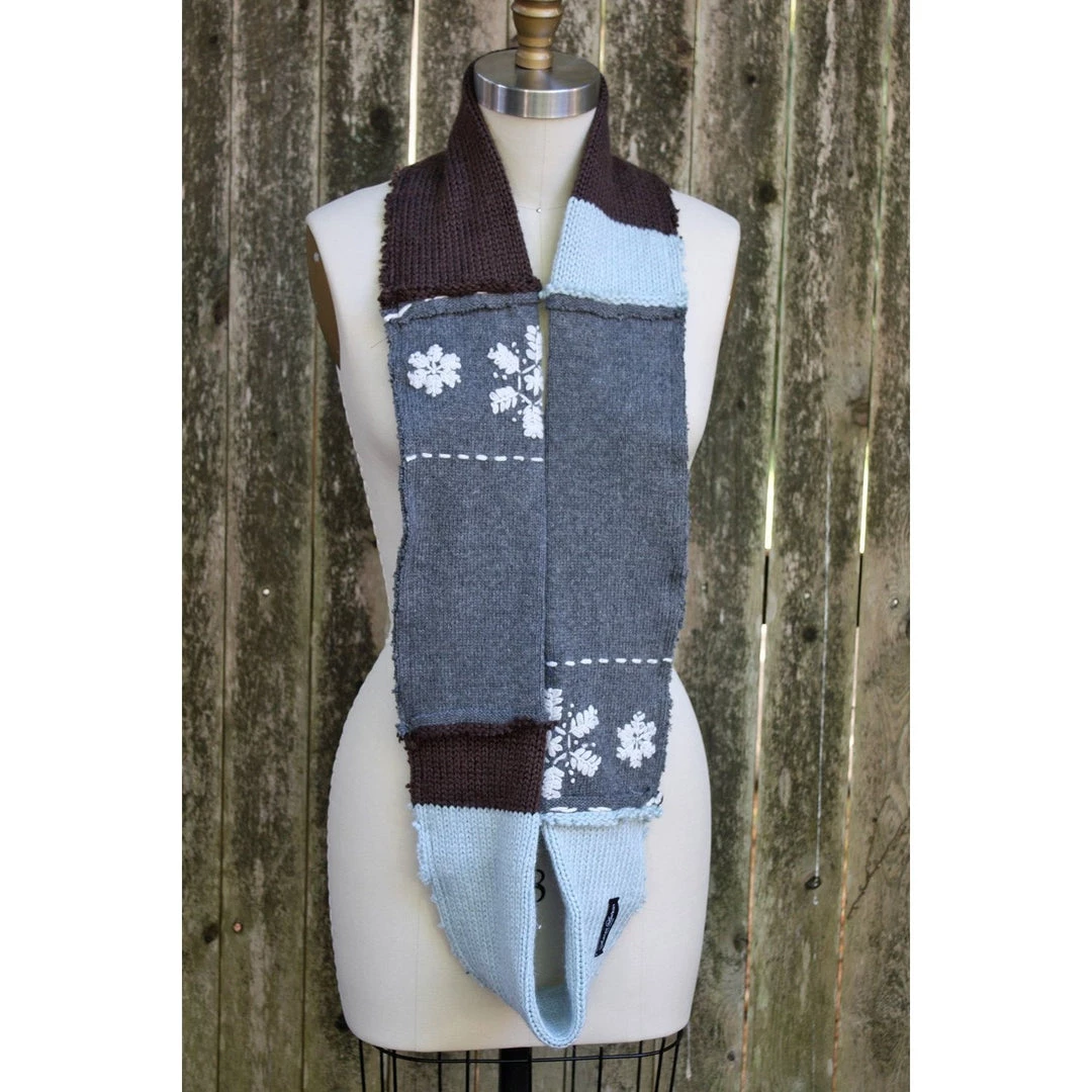 This light blue, chocolate brown and gray with snowflakes embroidered patchwork, infinity scarf is Eco-friendly since the materials are environmentally responsible. I take the unwanted and turn them into the wanted.