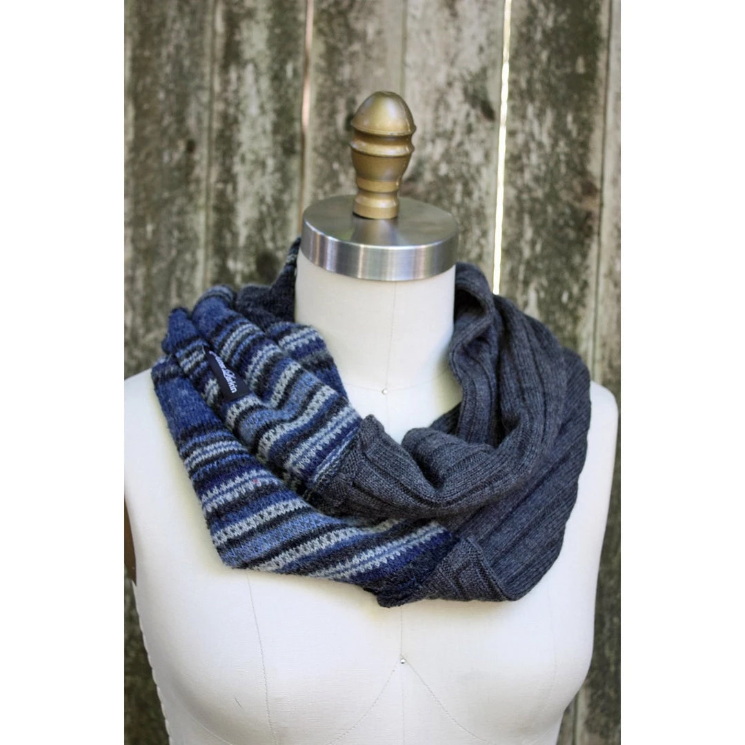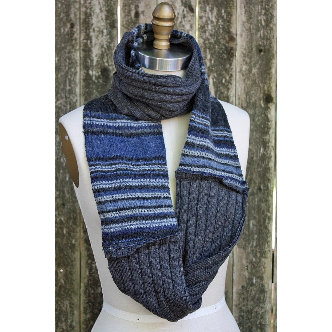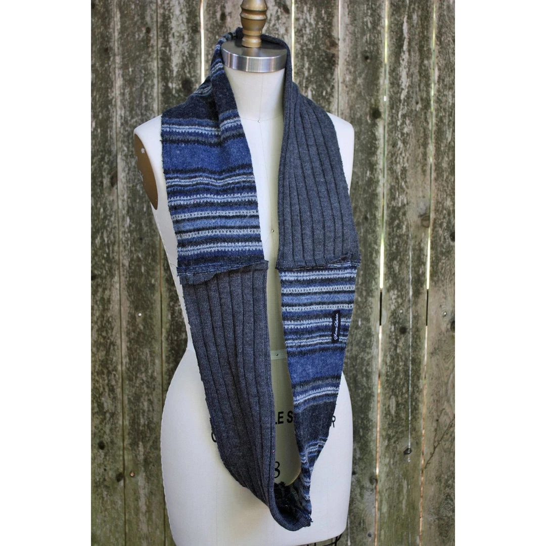 This blue stripes and grey, wool knit, patchwork, infinity scarf is Eco-friendly since the materials are environmentally responsible. I take the unwanted and turn them into the wanted.