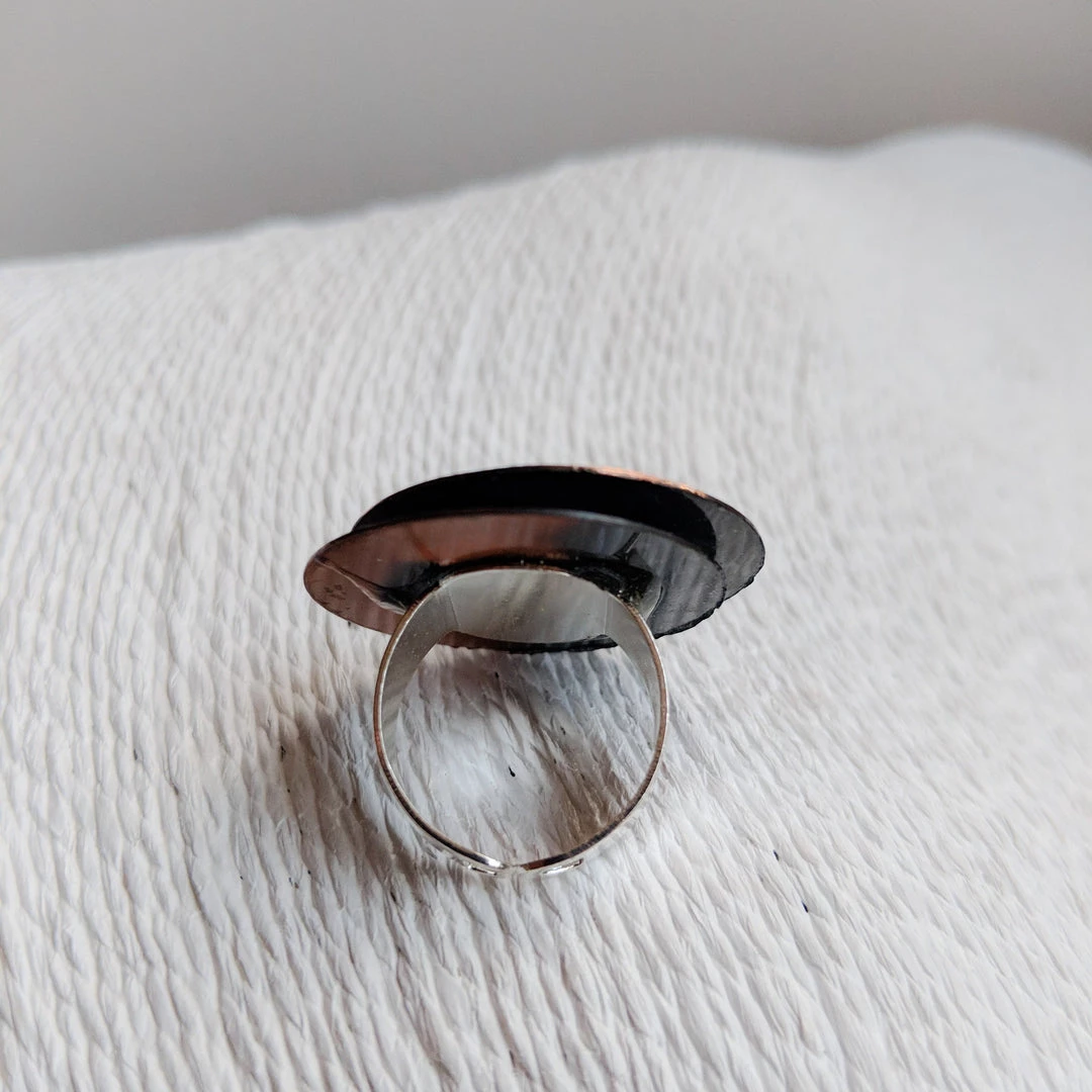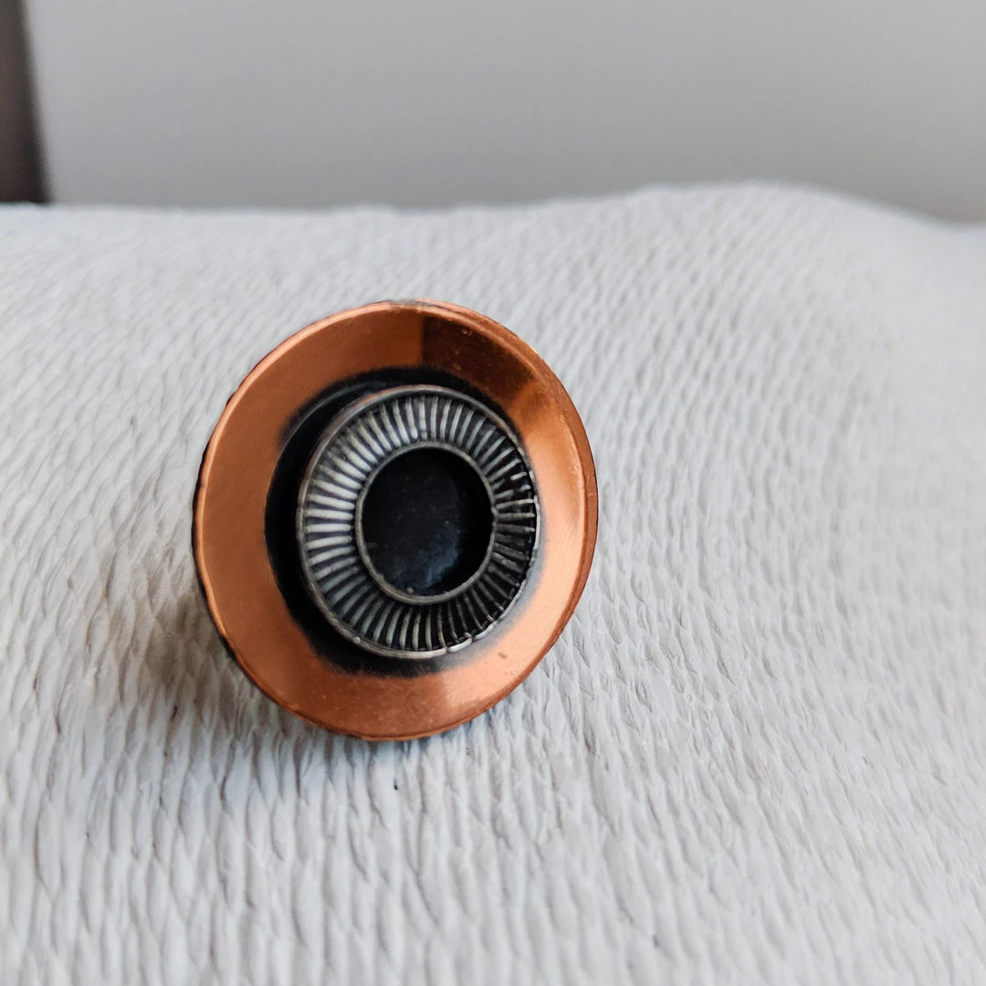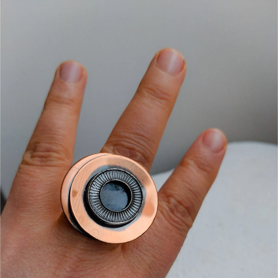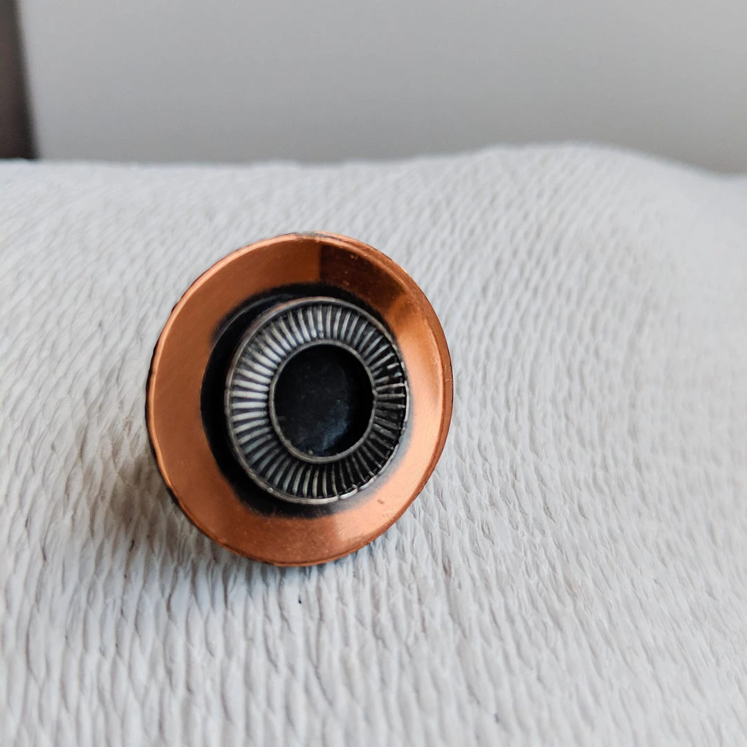Copper is cool. This ring was once a 1950 copper clip earring. It is the size of a quarter. It is a very lightweight ring. The ring will fit any size finger – the ring mount is adjustable. The copper has a bit of patina which adds to the character of the ring.Â