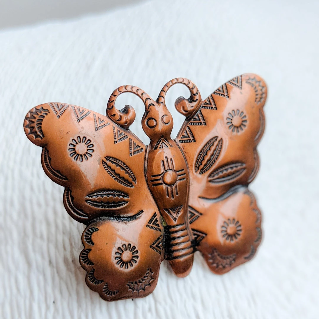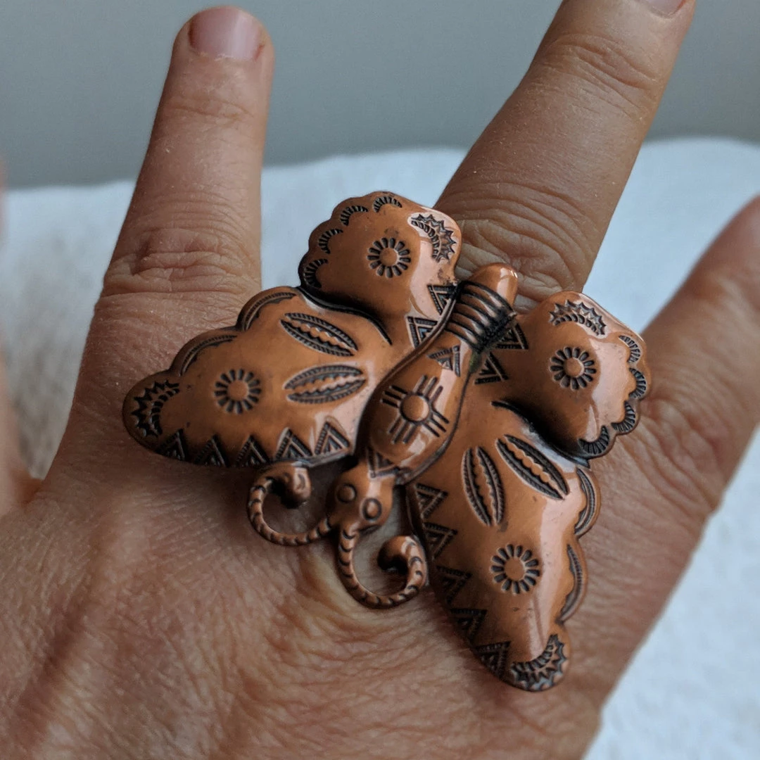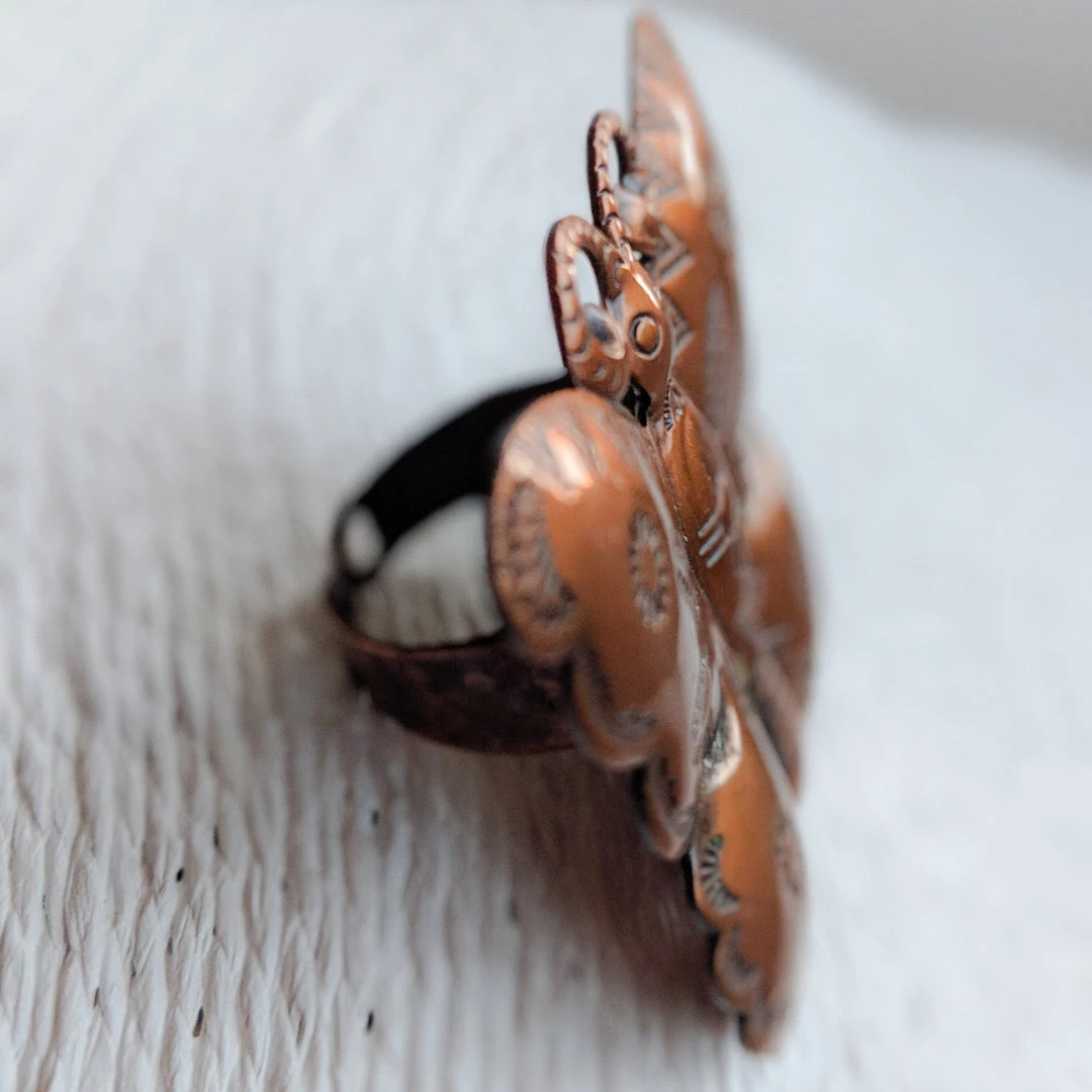 An upcycled 1970s copper pin is now a lovely modern ring. The ring is super lightweight. It will make a statement with any outfit. The ring is adjustable and will fit any size finger. The ring mount is hyperallergenic.