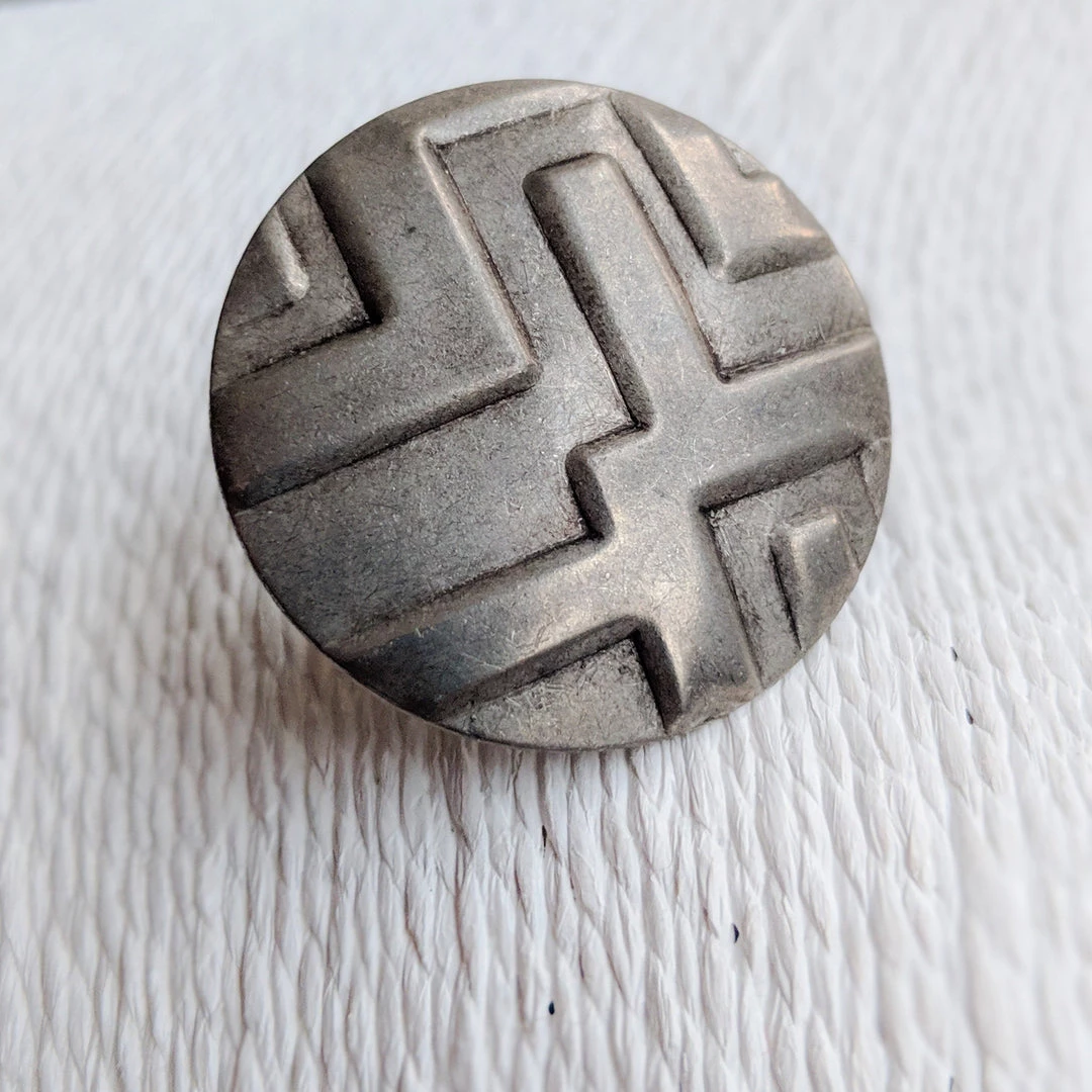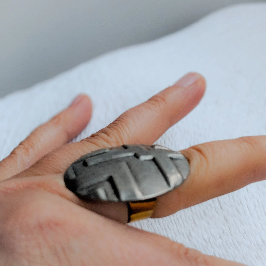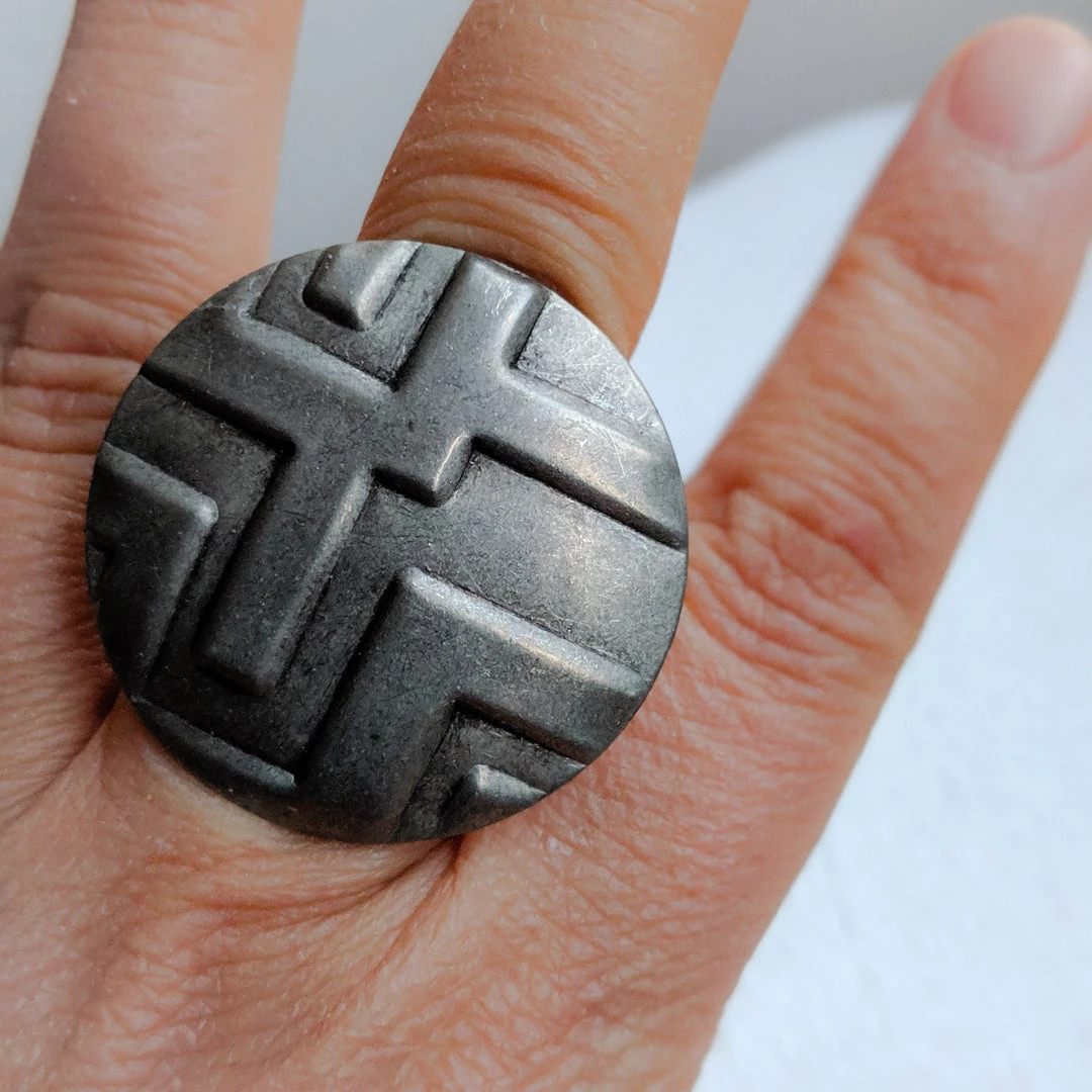 Tottally 80s! Here is a found vintage earring turned into a fashion forward statement ring, The large round piece is extremely lightweight. It will make any outfit POP! The ring mount is adjustable, so it will fit any size finger. What a great gift idea for the jewelry lover. The ring mount is hyperallergenic.