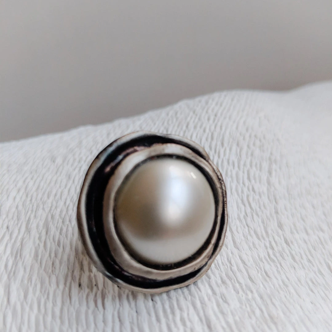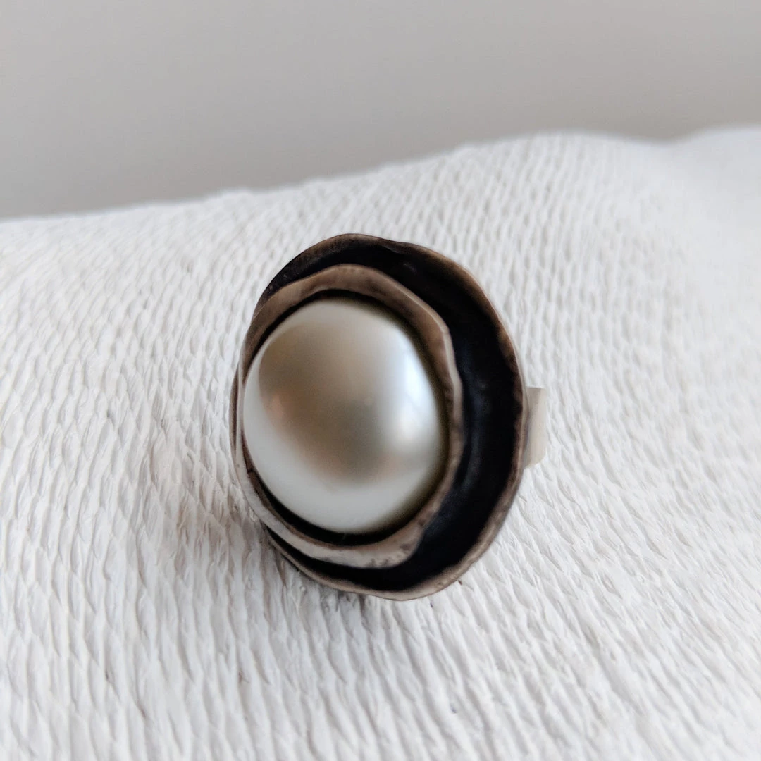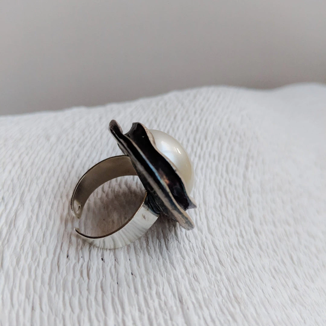 This ring once was a clip earring from the 1980s. Now, it is a lovely modern statement ring. It is lightweight and will go with anything in your closet. The ring fits any size finger. Not to worry, the ring mount does not contain nickel.