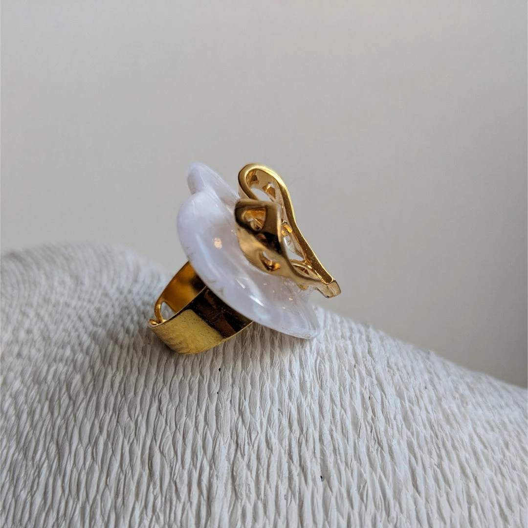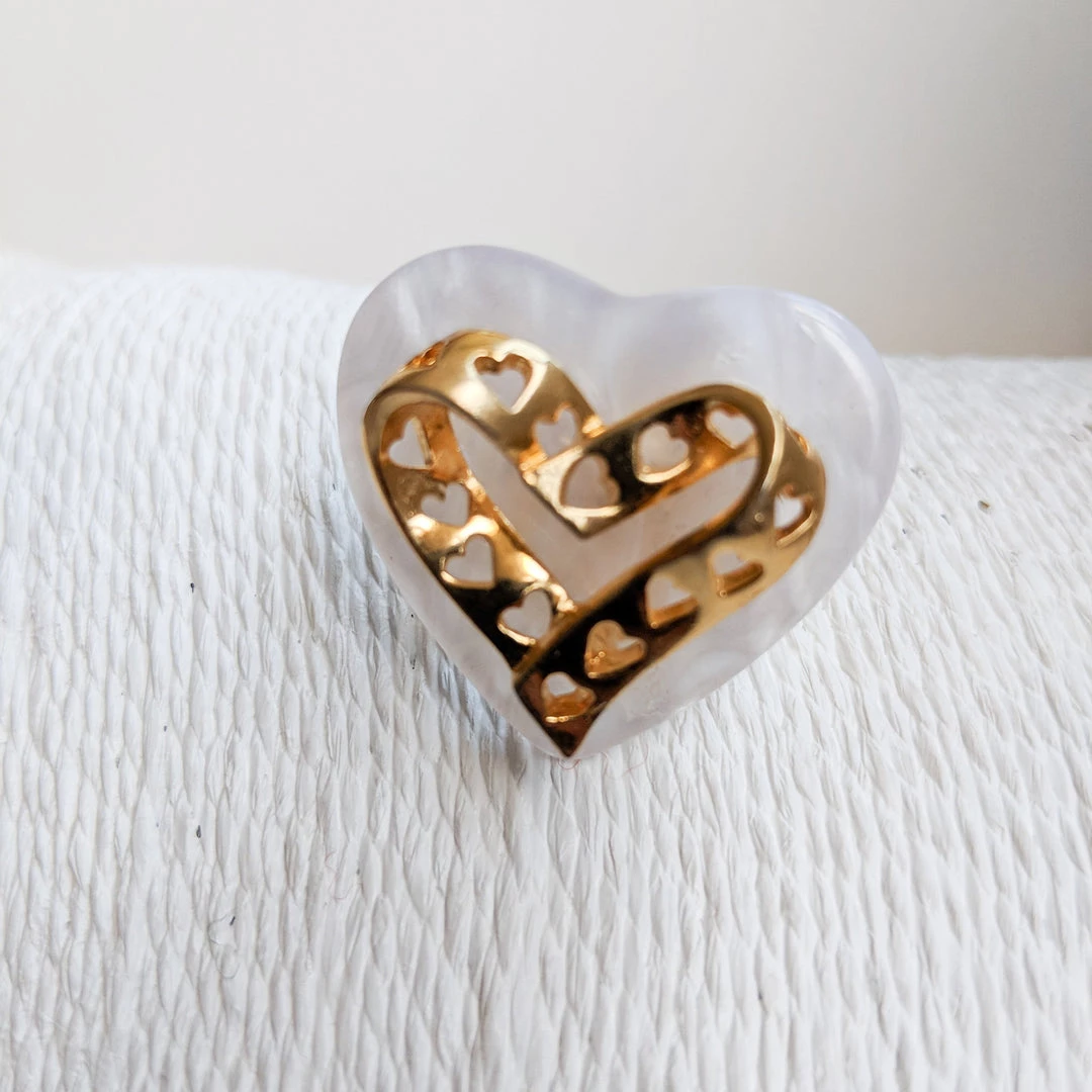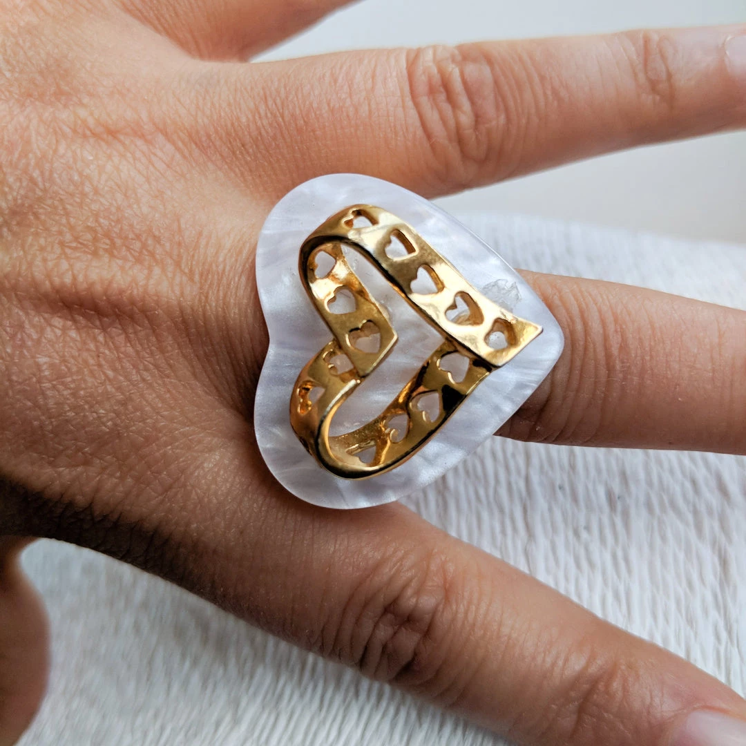 Who does not love heart? Here is a lovely double layered ring. The ring is extremely lightweight. It is a one of a kind ring because it is created with vintage found items. Also, it will fit any sized finger. The ring mount contains no nickel. What a great gift idea!