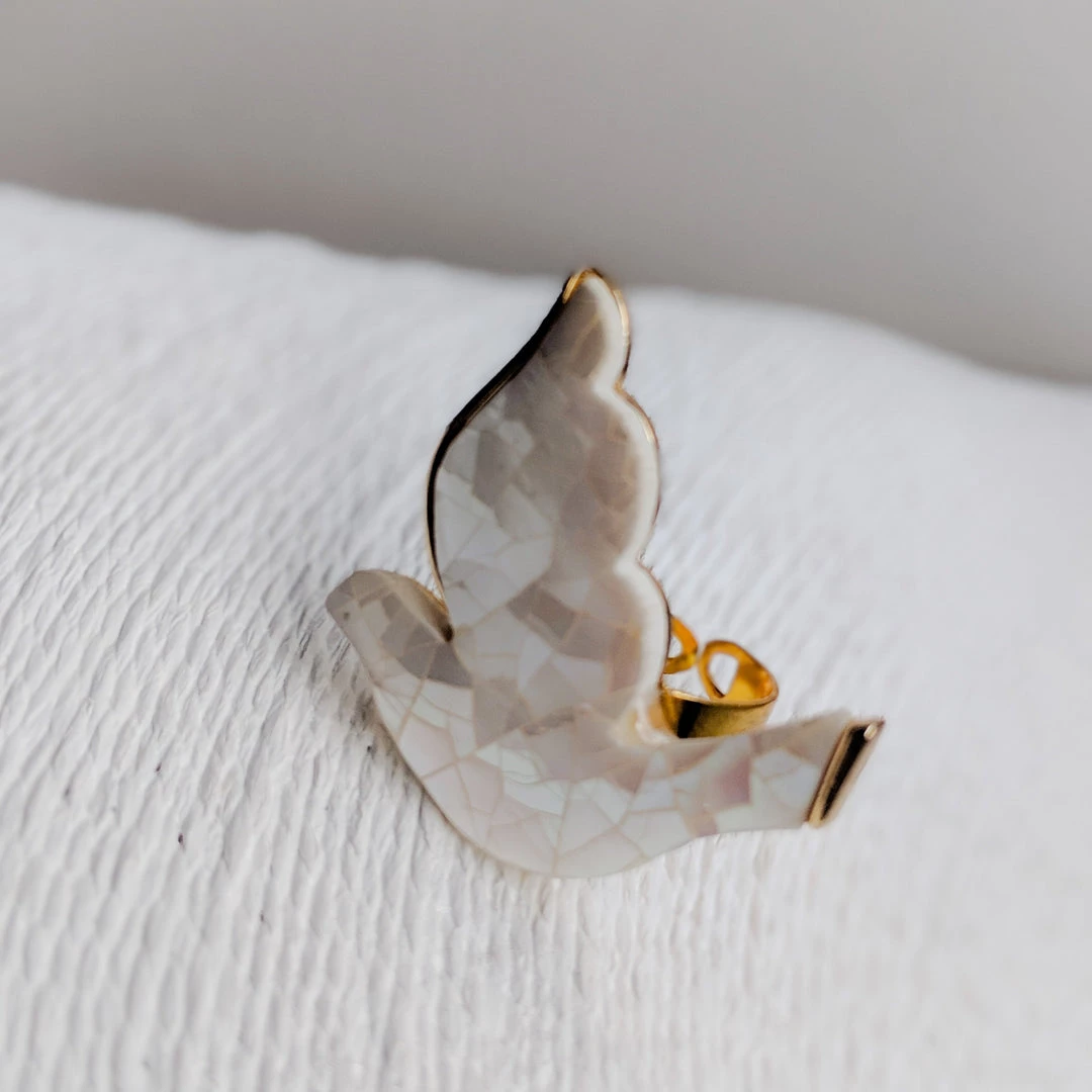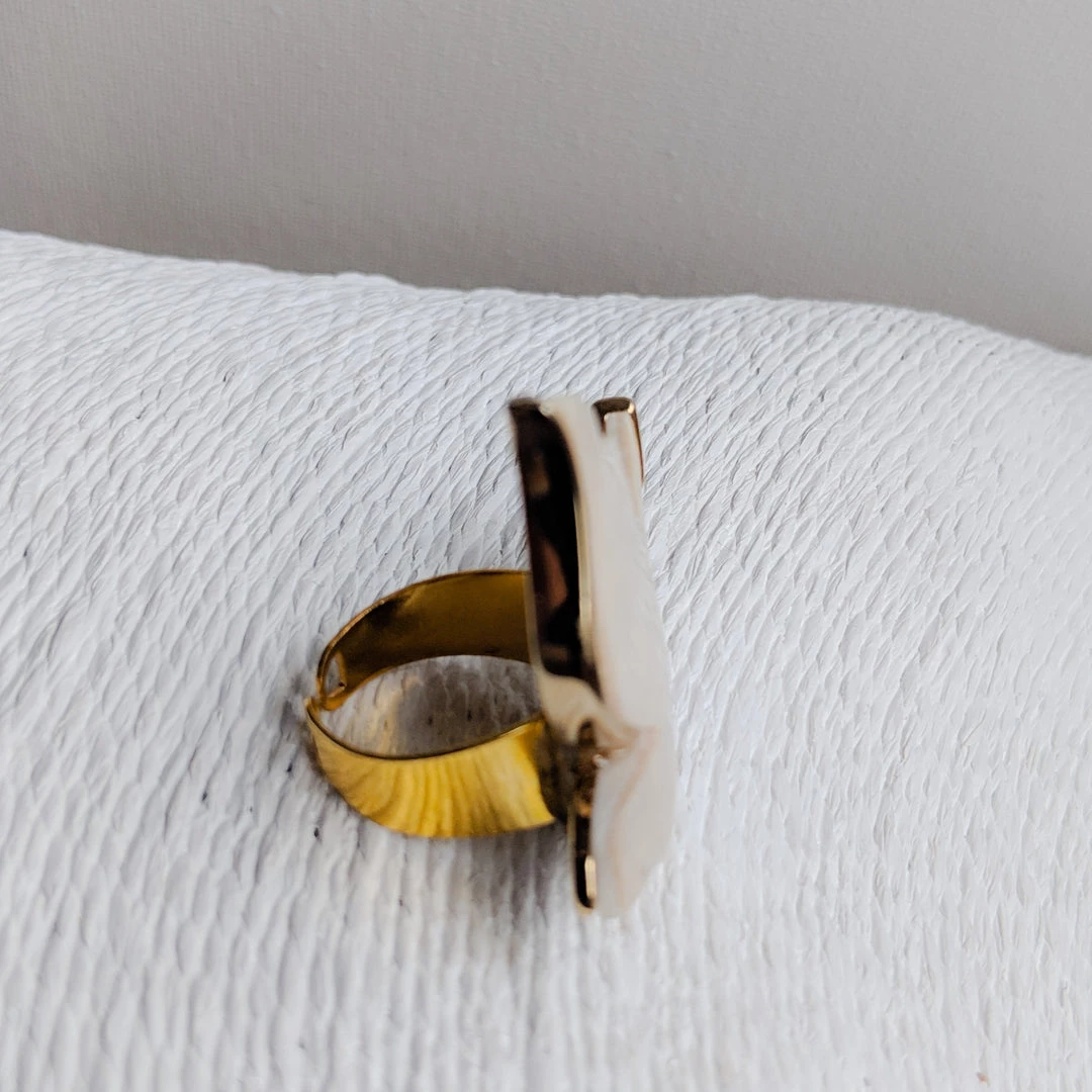 A lovely 1960s ring of a dove is now a modern fashion ring. The dove is highlighted with a bit of gold. It is a one of a kind ring. It will fit any size finger because it is adjustable. What a wonderful gift idea!