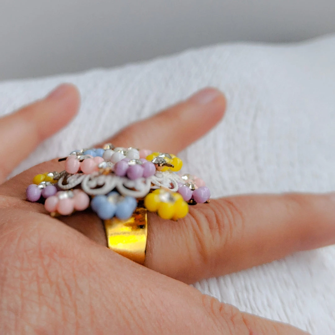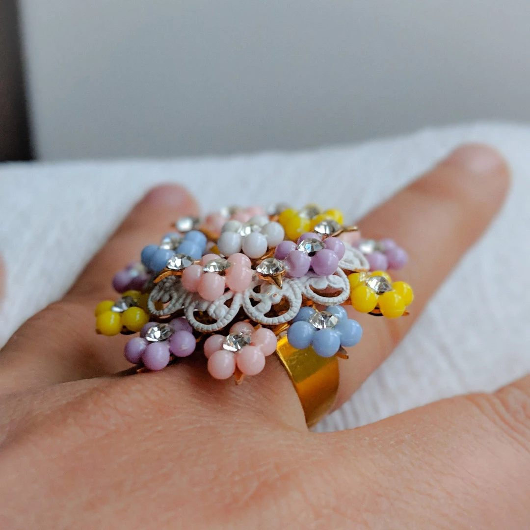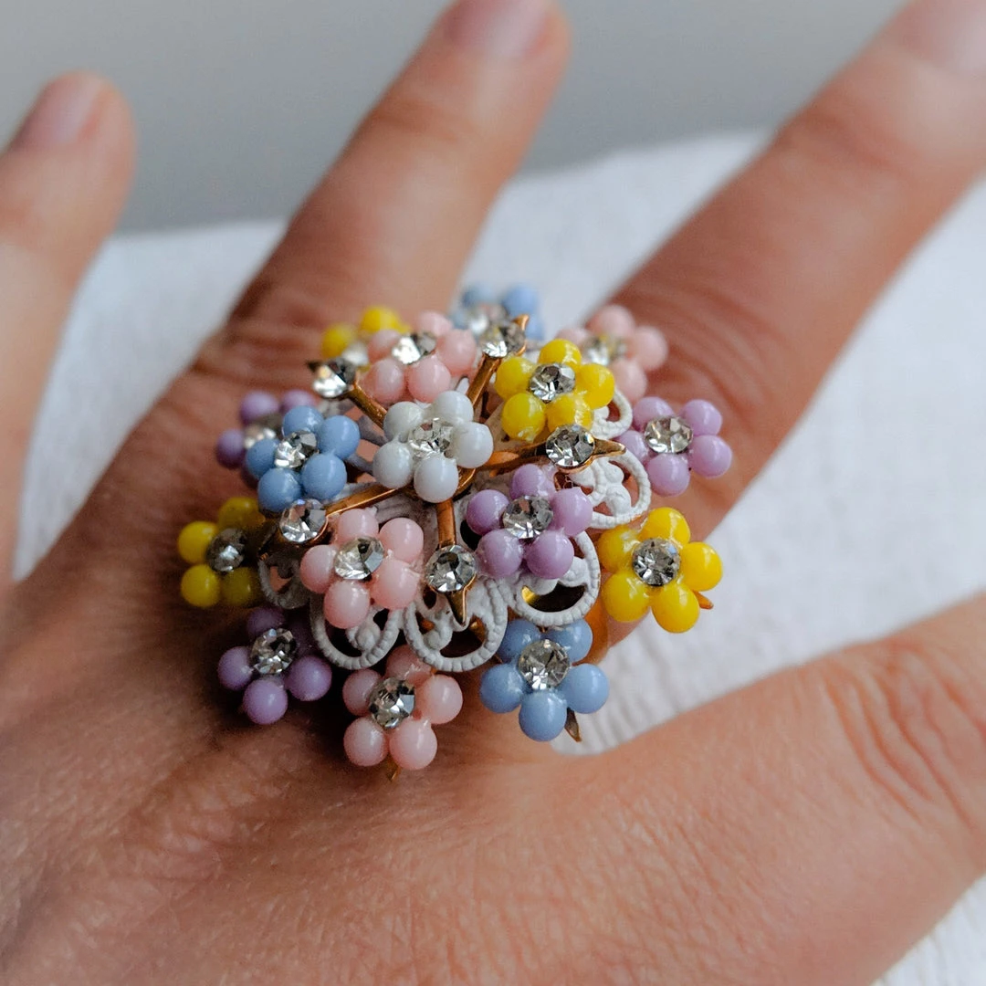 A lady-like 1950s clip earring is reborn into a modern fashion statement ring. It is so very sweet! Vintage rhinestones makes the perfect accent for each flower. What amazing detail. The ring is a bit on the larger size, yet extremly ight in weight. The ring will adjust to fit any size finger. What a lovely gift!