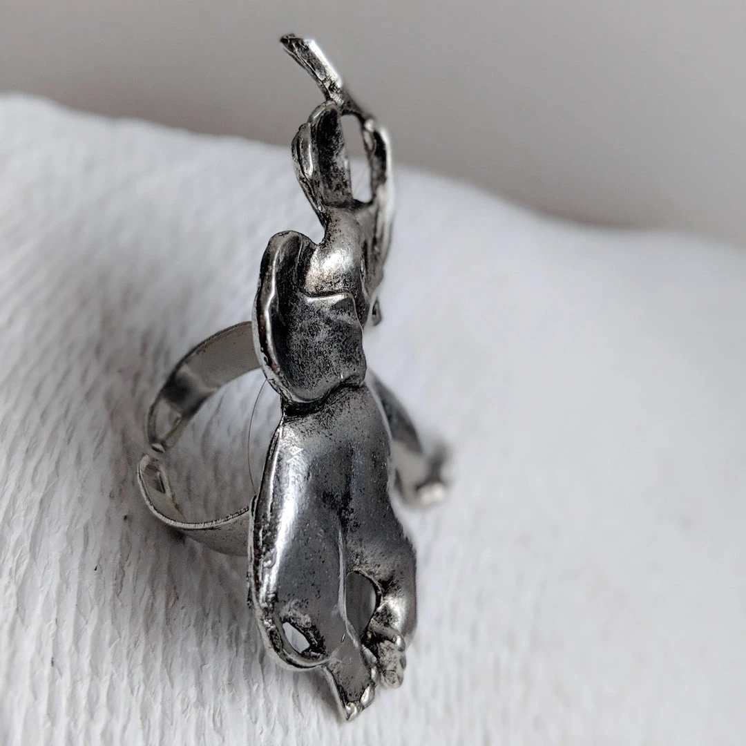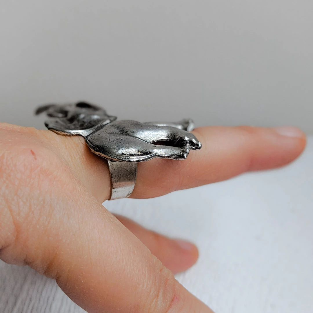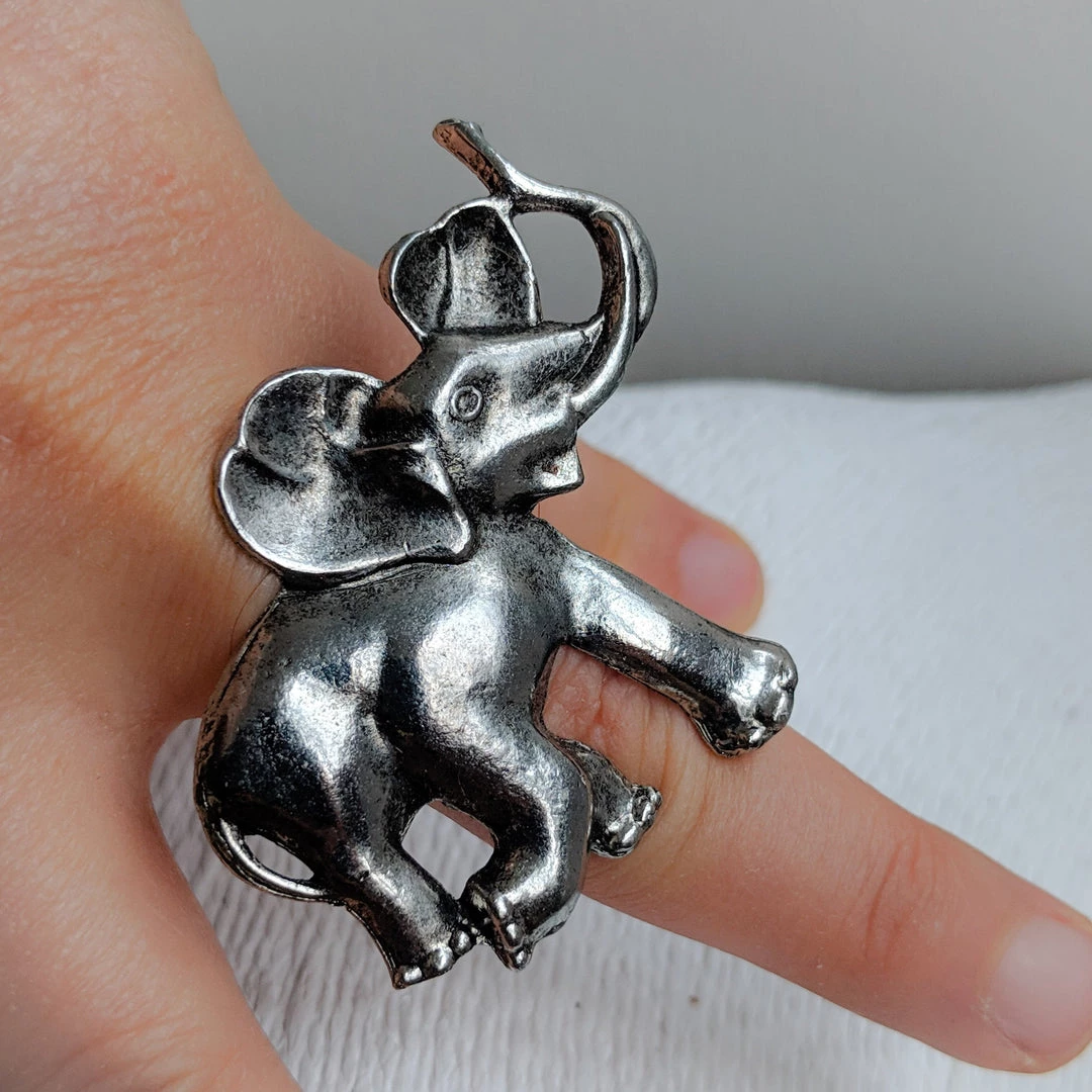 Elephants are lucky, but only when their trunks are pointed up. This 1960s pin has now evolved onto a modern fashion ring. The elepant is large, yet it is lightweight. The ring will fit any finger because it is adjustable. What a terrific gift idea!