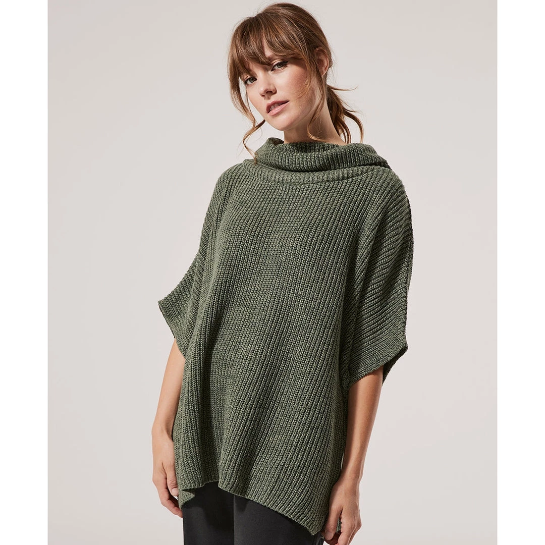 Women’s Dark Forest Heather Cowl Neck Cozy Sweater Poncho 1S. Super soft organic women’s clearance Cowl Neck Cozy Sweater Poncho from Wear PACT. Fair Trade Factory. GOTS Certified Organic Cotton